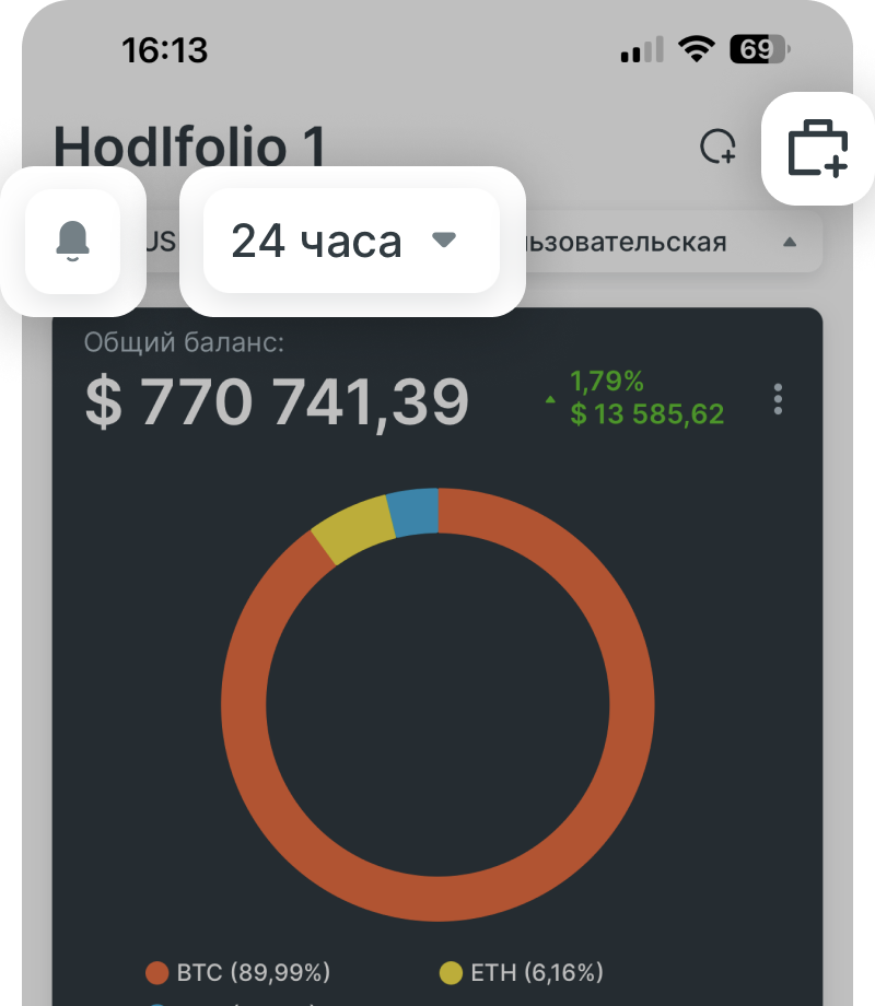 Hodlfolio не требует привязки к реальным кошелькам, вы можете добавлять любые покупки и продажи, выгружать портфели из приложения и загружать обратно.