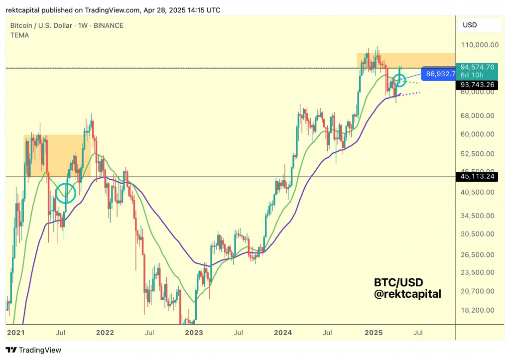 «Биткоин повторил движение цены в середине 2021 года с прорывом из диапазона, образованного двумя EMA, выполняющими роль поддержки бычьего цикла», — резюмировал Rekt Capital.