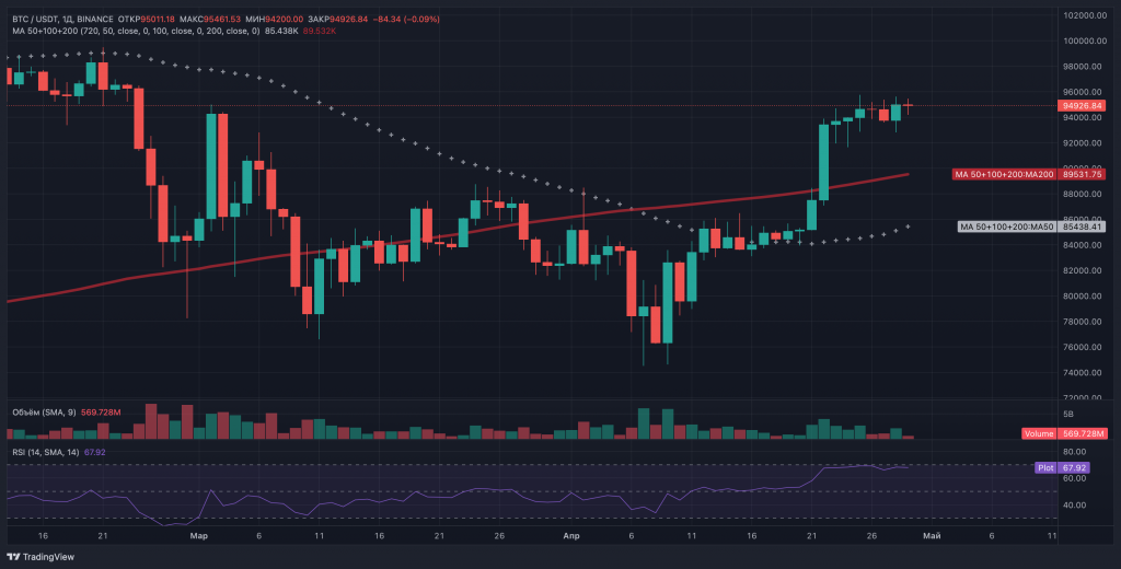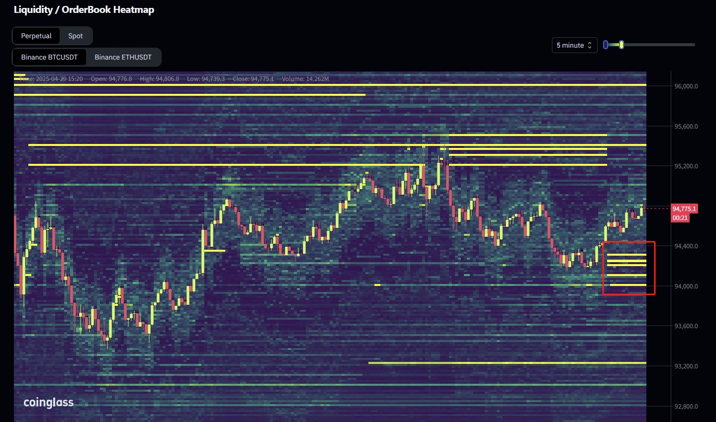 Краткосрочными ценовым магнитом для BTC также является уровень $94 тыс. благодаря стене ордеров на покупку, размещенных на бирже фьючерсов Binance. Эта ликвидность была отмечена ресурсом мониторинга CoinGlass 29 апреля.