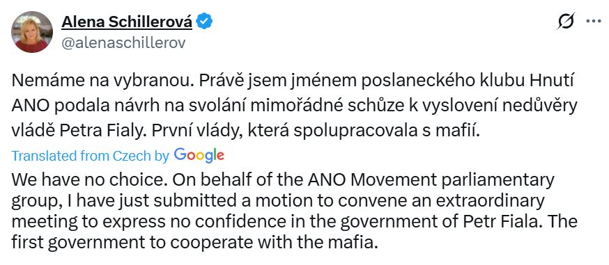 Алена Шиллерова, заместитель лидера правой партии ANO, заявила в посте на X, что её фракция считает необходимым направить вотум недоверия, который будет рассмотрен во вторник.