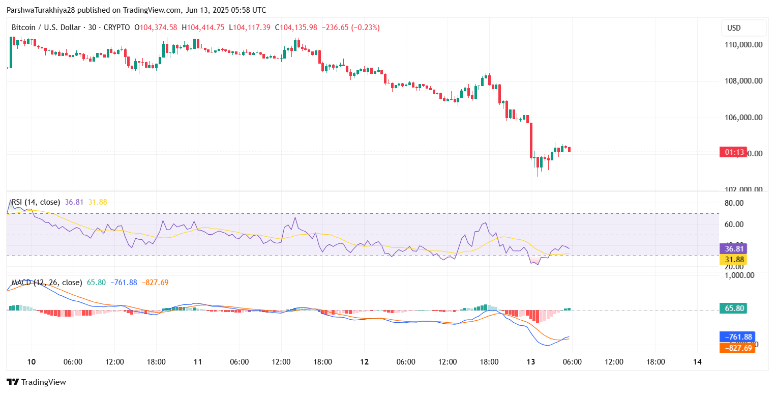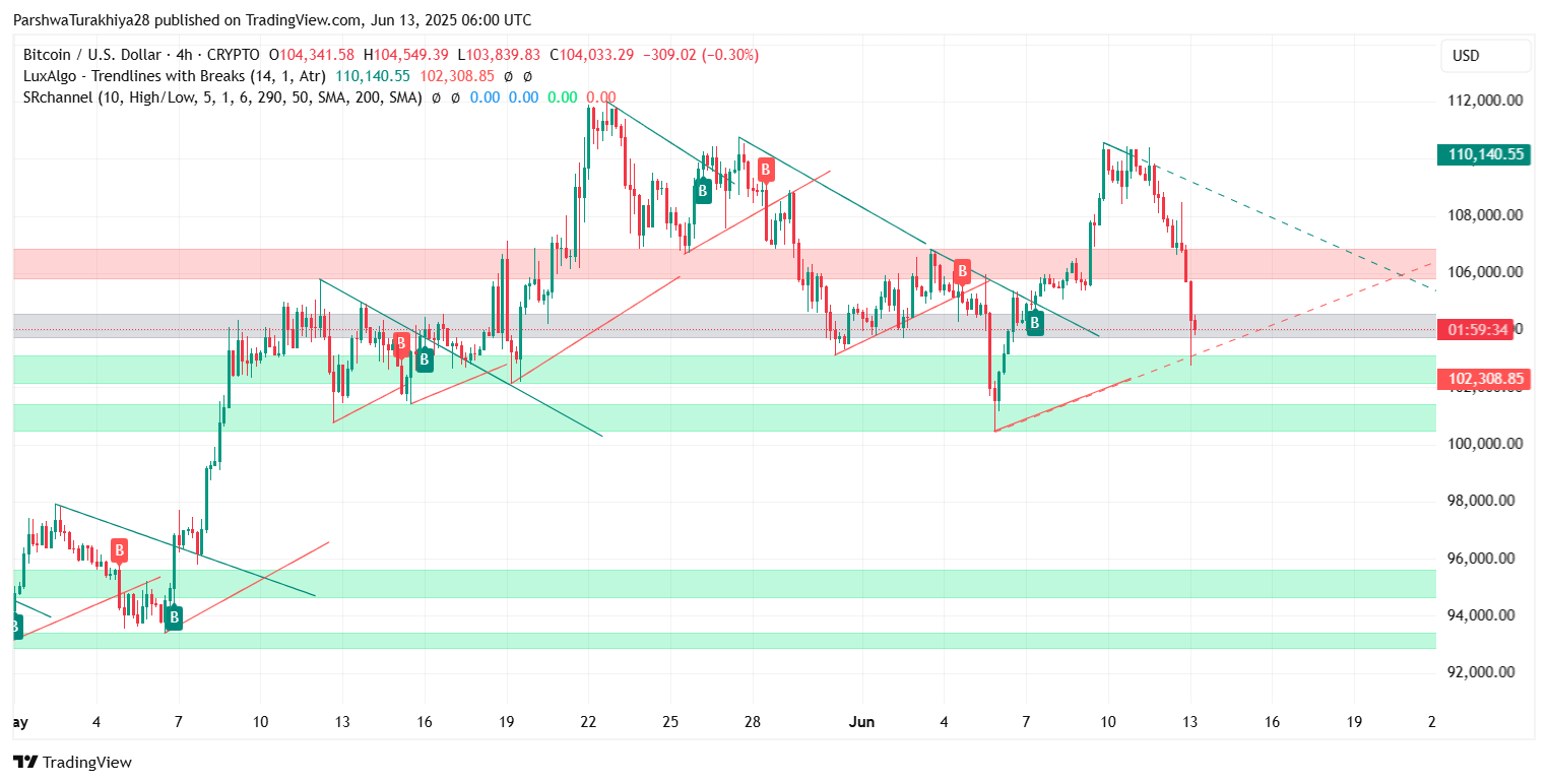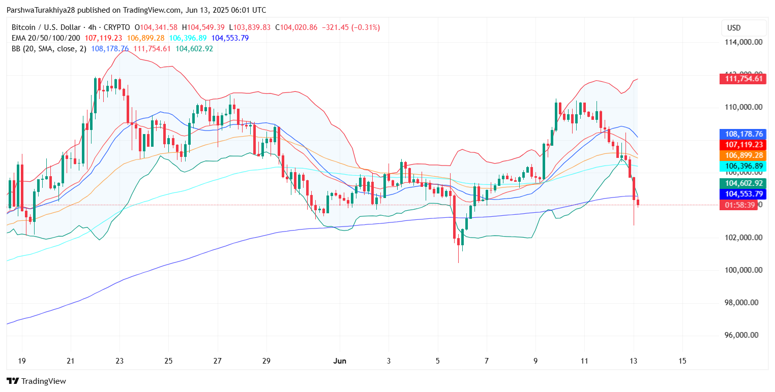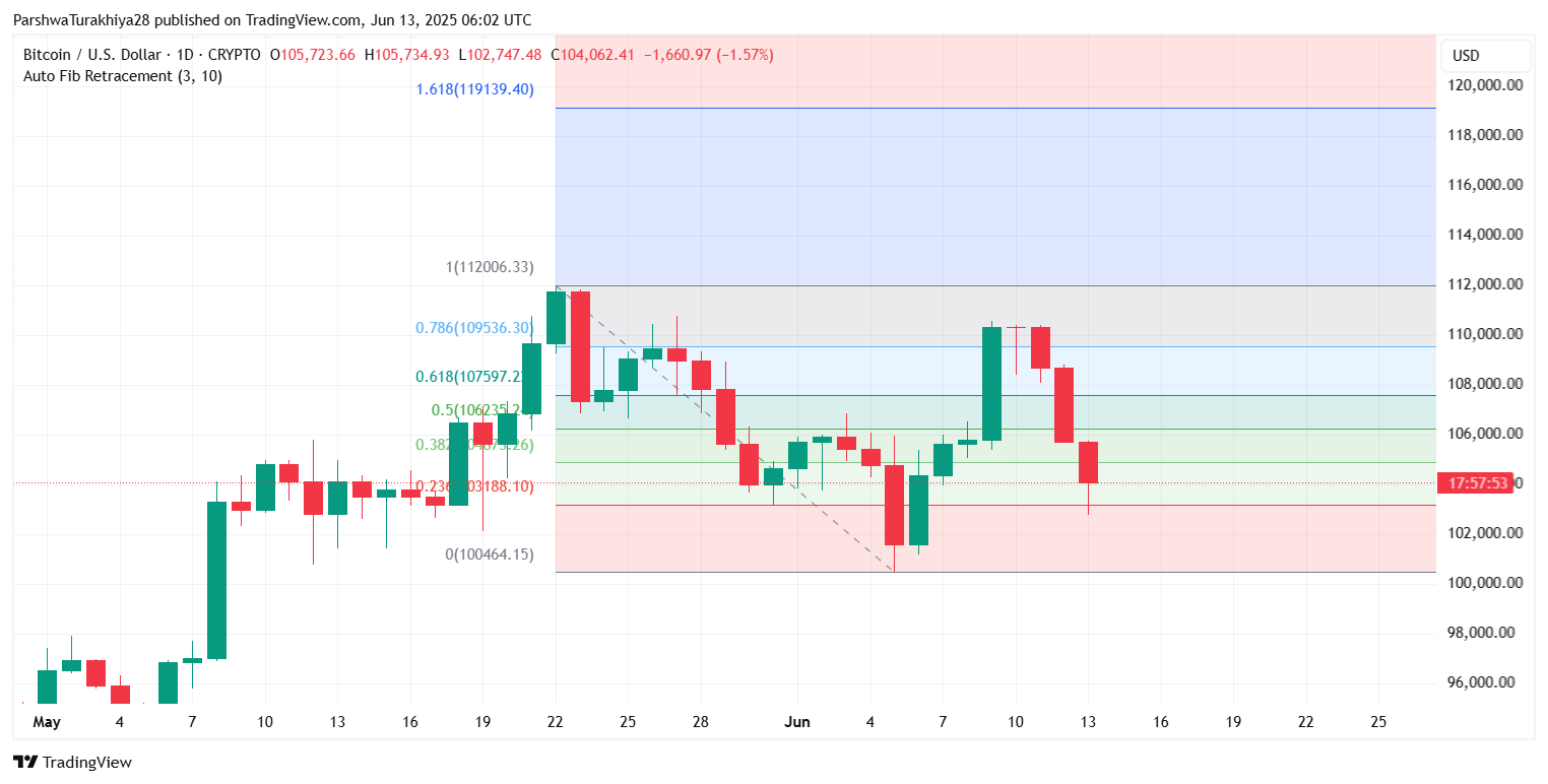 После интенсивного давления продаж по основным криптовалютам цена биткоина сегодня упала до примерно $104 020, снизившись почти на 1,6% за последние 24 часа. Эта коррекция произошла всего через несколько дней после того, как быки не смогли удержать поддержку выше уровня коррекции Фибоначчи 0,5 около $106 235, что привело к резкому отскоку от верхнего сопротивления на $110 000.