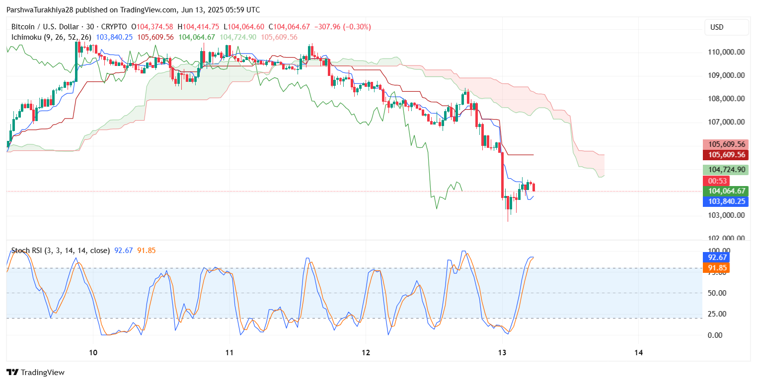 Облако Ишимоку на 30-минутном графике показывает плоское сопротивление Кумо на уровне $105 600, что затрудняет любые краткосрочные попытки роста, если только быки решительно не вернут себе эту зону. Stochastic RSI, который сейчас колеблется около 92, предполагает, что отскок облегчения может быстро терять обороты.