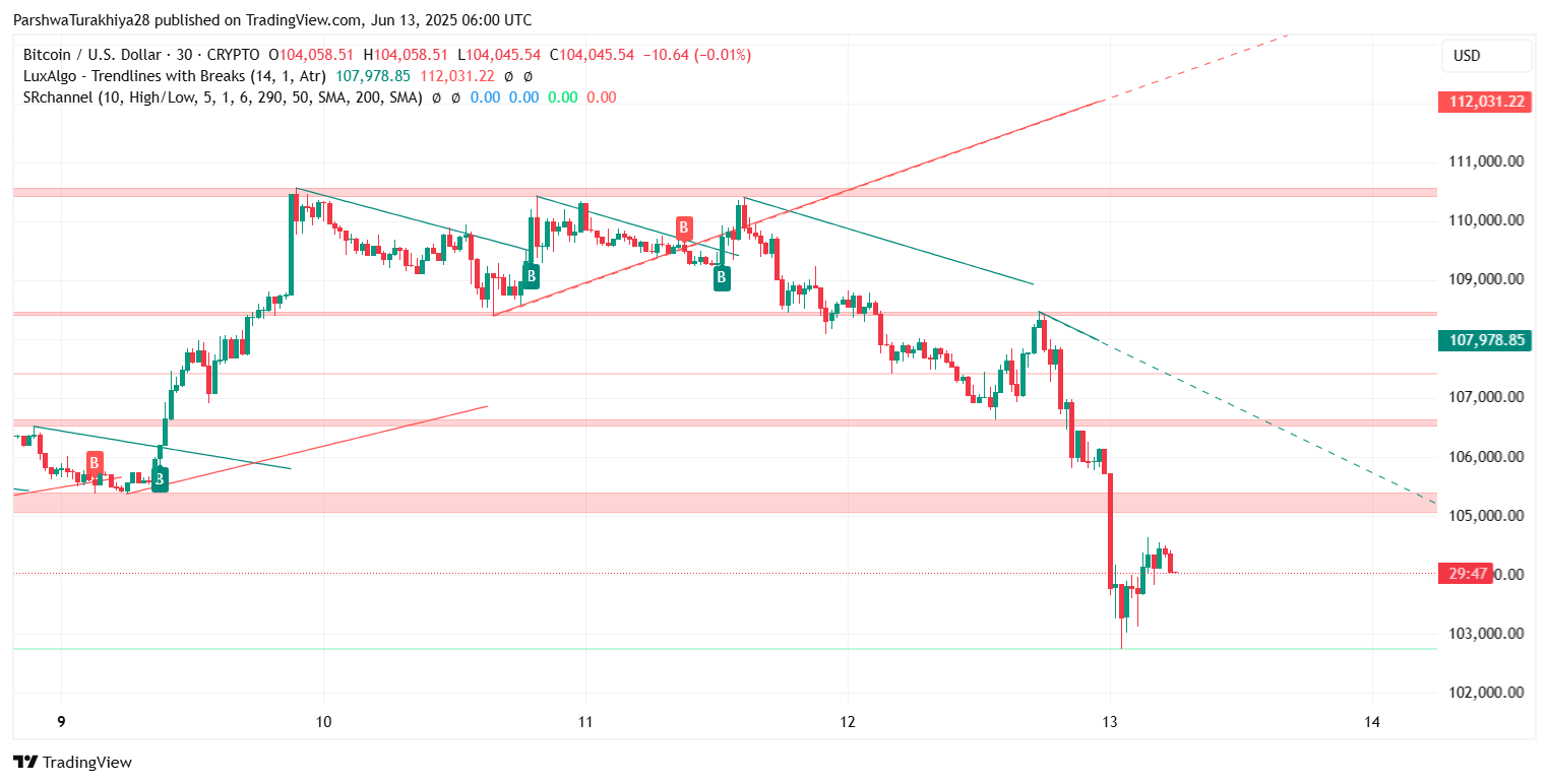 Недавнее падение ценового действия биткоина является частью более широкого структурного пробоя, который виден на более низких и более высоких таймфреймах. На 30-минутном графике BTC пробил ключевой регион поддержки между $105 000 и $104 500, после чего прорыв повторно протестировал нижнюю полосу Боллинджера около $104 000.