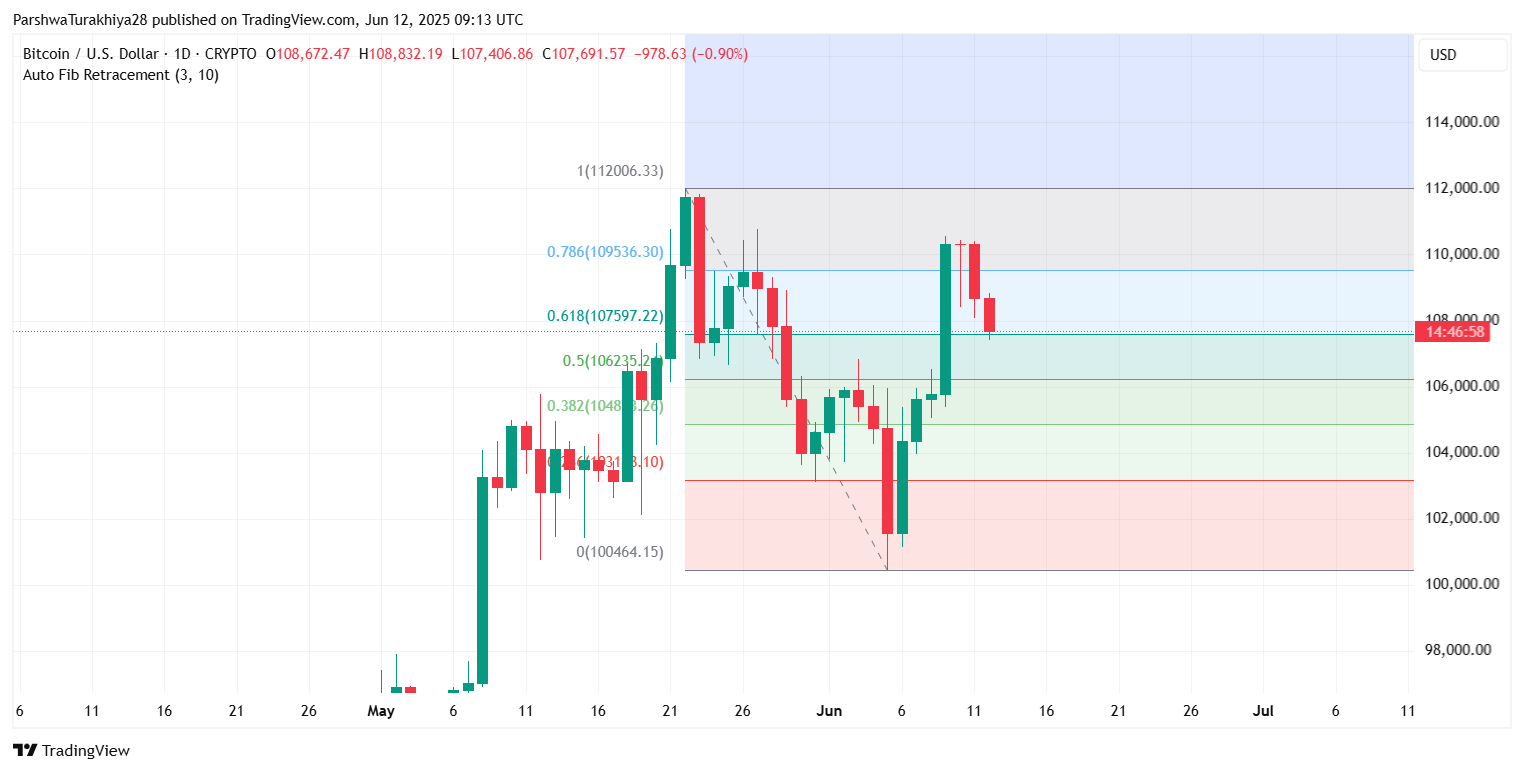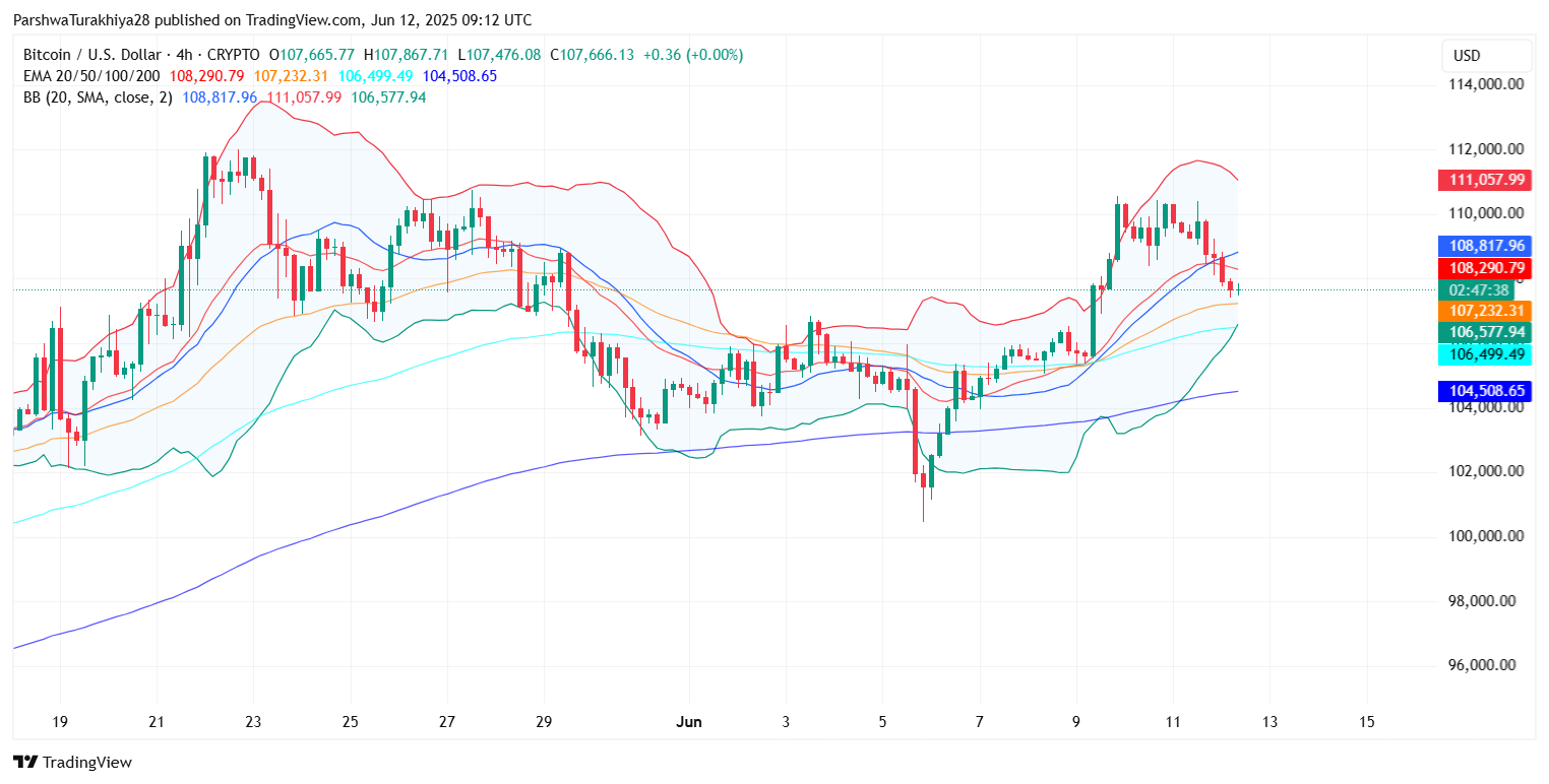 Цена биткоина сегодня торгуется около $107 690 после небольшого падения с пика понедельника выше $110 800. В то время как более широкий восходящий тренд остается неизменным на более высоких таймфреймах, внутридневные графики показывают ранние признаки истощения, особенно когда BTC тестирует слияние сопротивления около уровня Фибоначчи 0,618 и верхней полосы Боллинджера. Трейдеры внимательно следят за тем, сможет ли ценовое действие биткоина стабилизироваться выше ключевых скользящих средних или возникнет ли дальнейшее нисходящее давление в ближайшей перспективе.