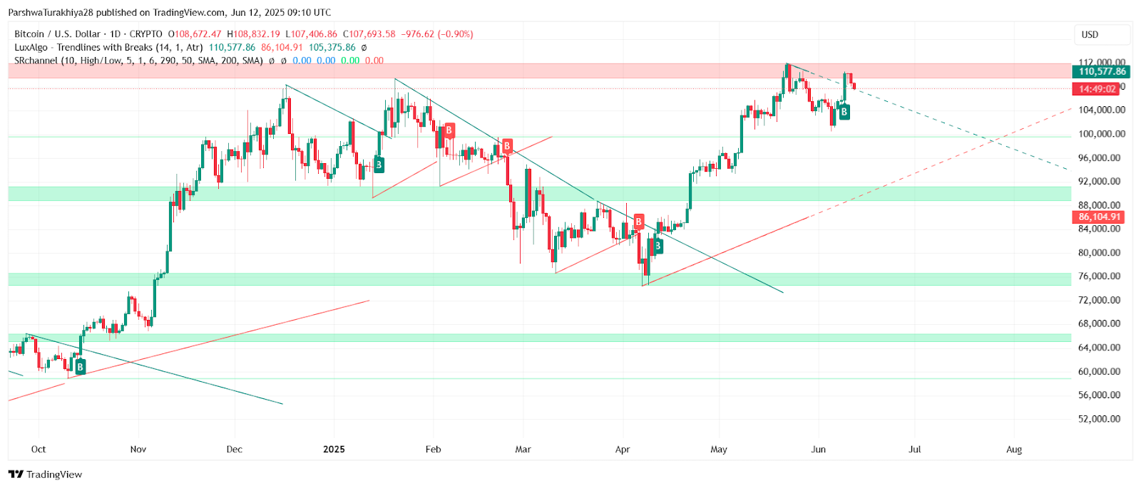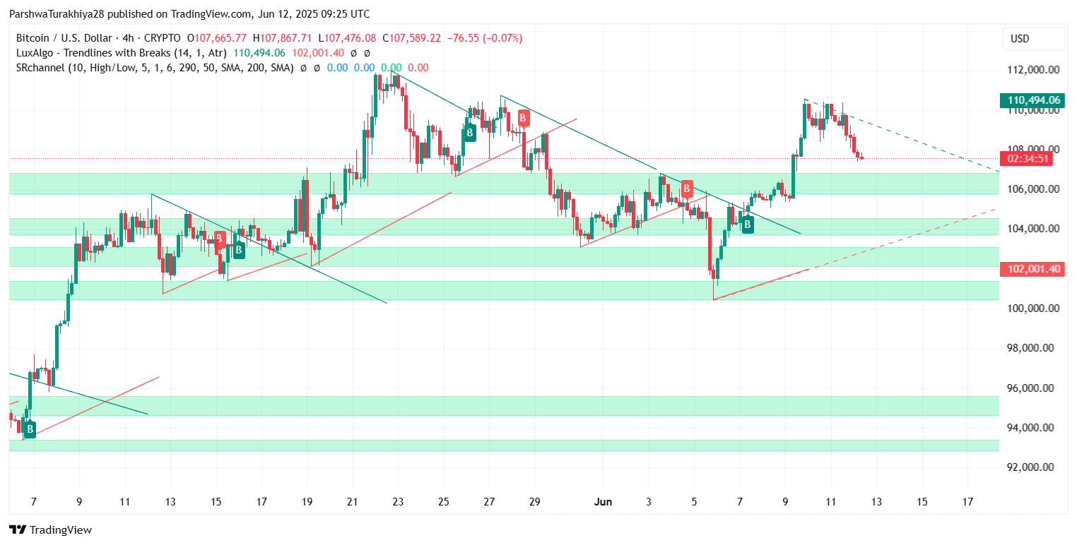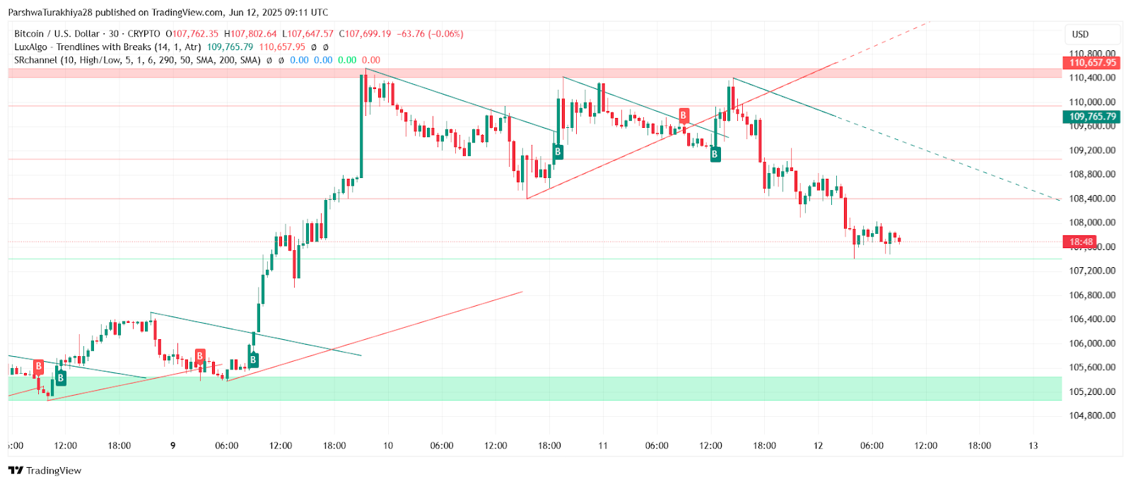 Поскольку BTC консолидируется прямо под ключевым сопротивлением, трейдерам следует сосредоточиться на том, как цена ведет себя около зоны поддержки $107 200–$106 250. Прорыв ниже $106 250 может подтвердить краткосрочный максимум, в то время как восстановление $108 300 может спровоцировать еще один тест $110 000.