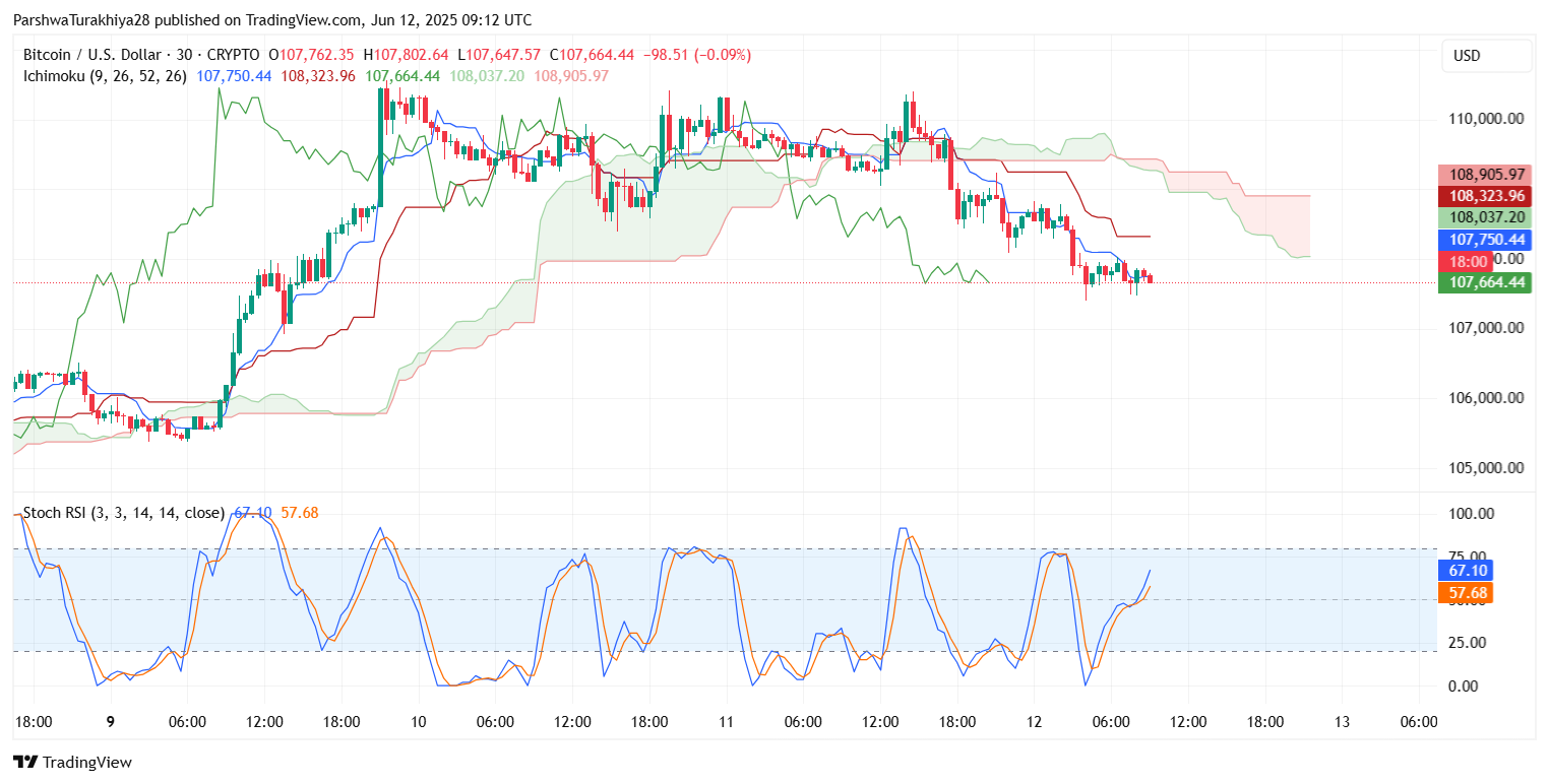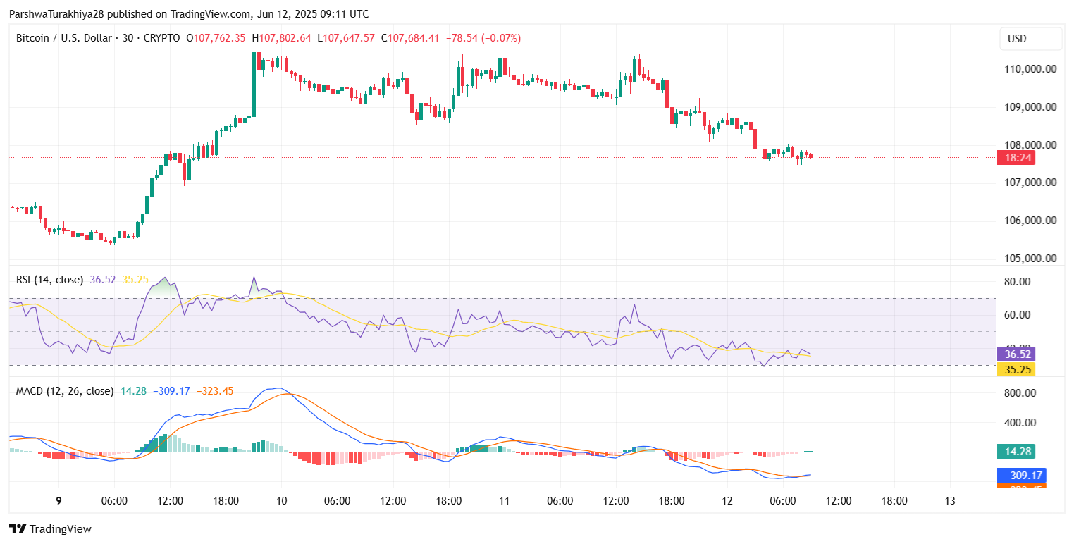 На 30-минутном графике BTC колеблется в диапазоне от $108 300 до $107 600, MACD находится в отрицательной зоне, а RSI колеблется около 36. RSI показывает устойчивое медвежье давление внутри дня, а гистограмма подтверждает ослабление импульса. Однако линии MACD начинают выравниваться, что говорит о том, что медведи теряют запал. Это предполагает потенциальную боковую консолидацию перед следующим движением.
