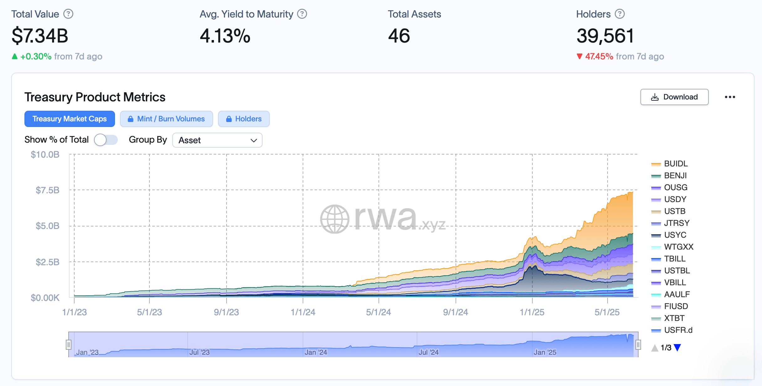 Zum 12. Juni 2025 wird der blockchain-integrierte US-Treasury-Fondsmarkt laut rwa.xyz-Statistiken auf 7,34 Milliarden USD bewertet. Seit dem 24. Mai hat der Sektor ungefähr 340 Millionen USD an Zuflüssen angezogen, was einem Anstieg von 4,86 % entspricht. Blackrocks USD Institutional Digital Liquidity Fund, bekannt unter dem Ticker BUIDL, hat derzeit eine Marktkapitalisierung von 2,890 Milliarden USD—ein leichter Rückgang um 23 Millionen USD von den 2,913 Milliarden USD, die 19 Tage zuvor registriert wurden.