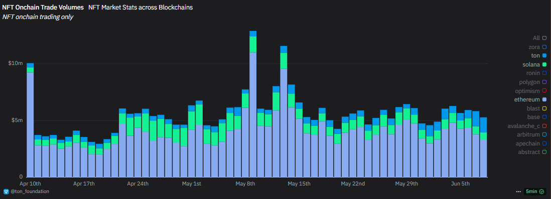 TON является второй по активности сетью для торговли NFT после Ethereum благодаря росту популярности TelegramКоллекционных подарков. Павел Дуров, основатель Telegram, отметил, что за последние 30 дней активность коллекции резко возросла.