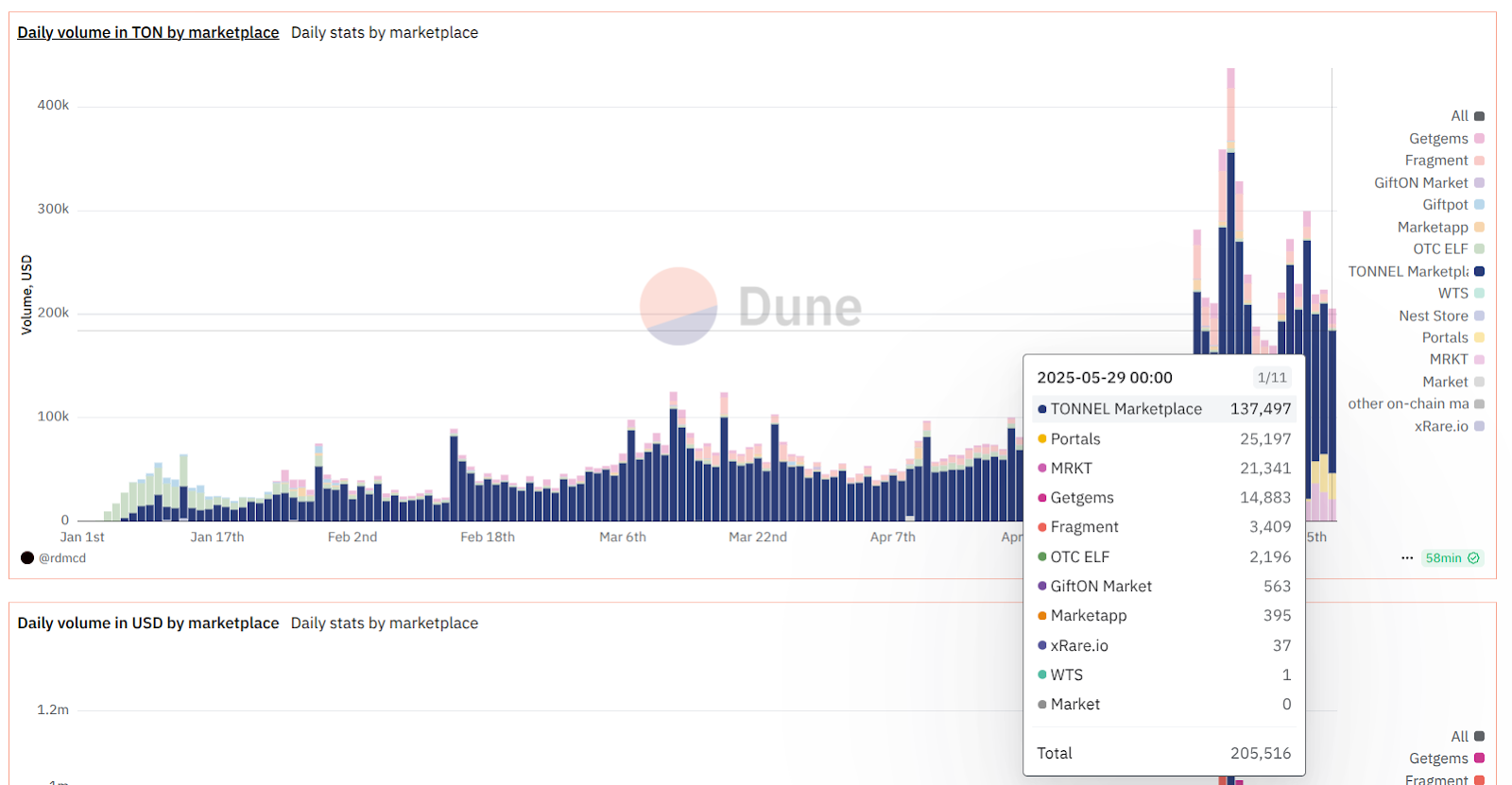 Согласно Dune Analytics, запущенный 27 мая маркетплейс занял второе место по дневным объемам торгов среди платформ для Telegram-подарков.