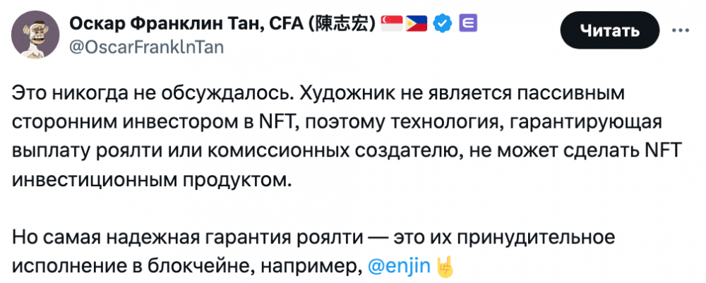 «Художник или создатель не является ни инвестором, ни пассивной третьей стороной в NFT», — сказал он, отметив, что выплаты роялти не считаются инвестиционным доходом.