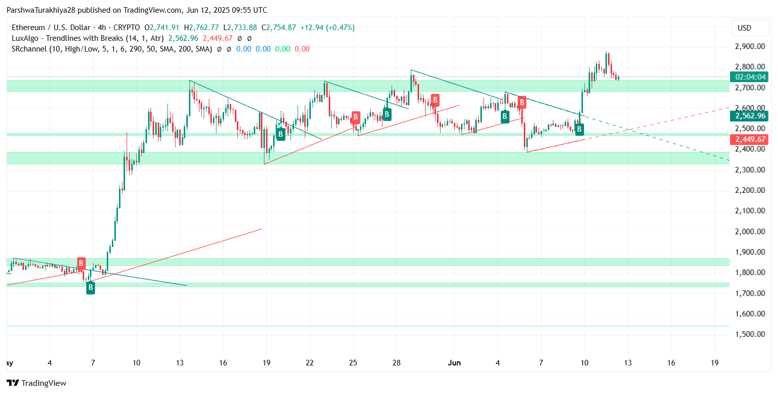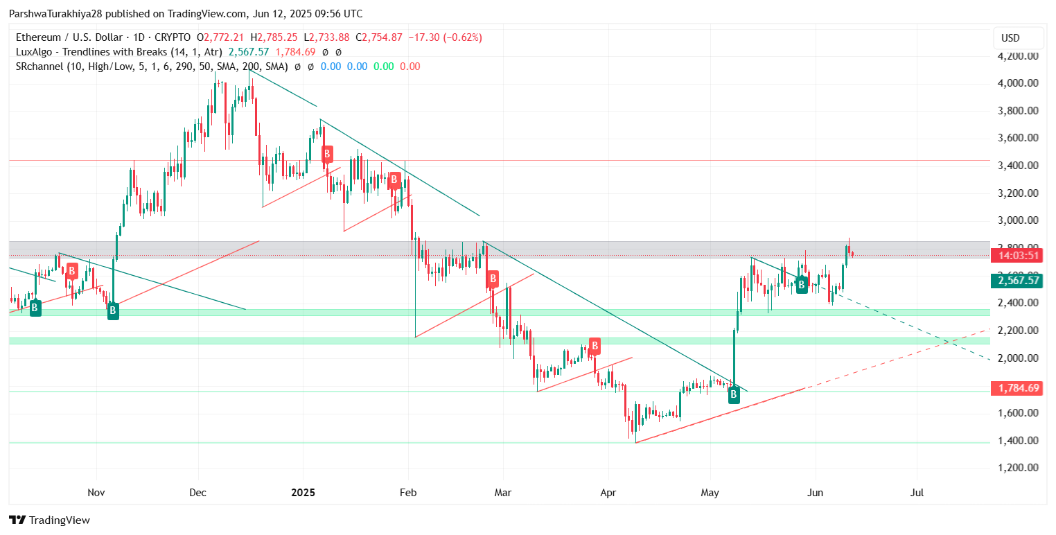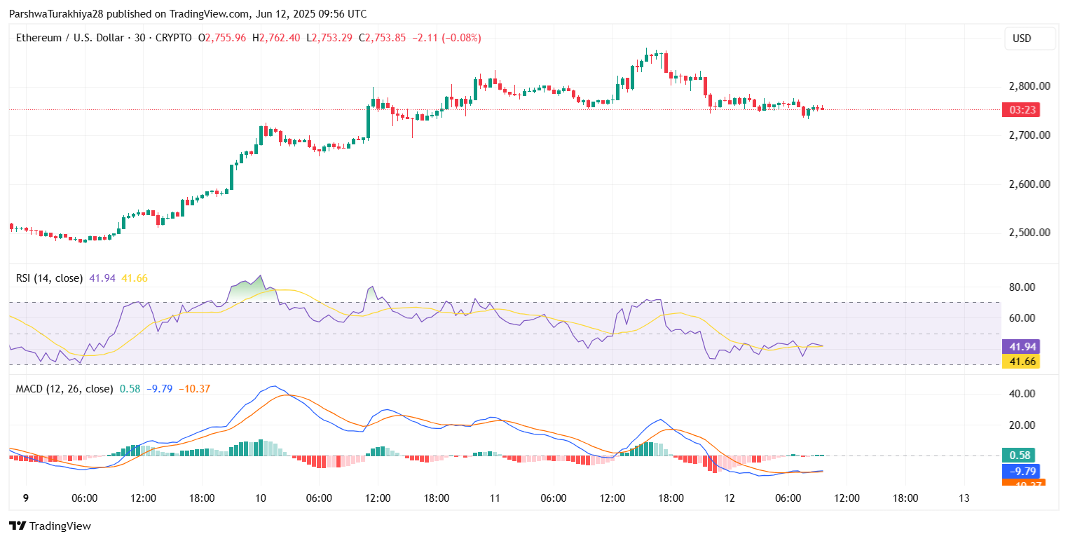 Цена Ethereum сегодня держится около $2755 после волатильной сессии 12 июня, когда быки ненадолго отвоевали уровень $2800, прежде чем немного перейти в консолидацию. Хотя краткосрочный импульс остыл, более широкая структура тренда остается бычьей, поскольку цена удерживается выше ключевых скользящих средних и восстанавливает важные уровни прорыва с начала этого месяца.
