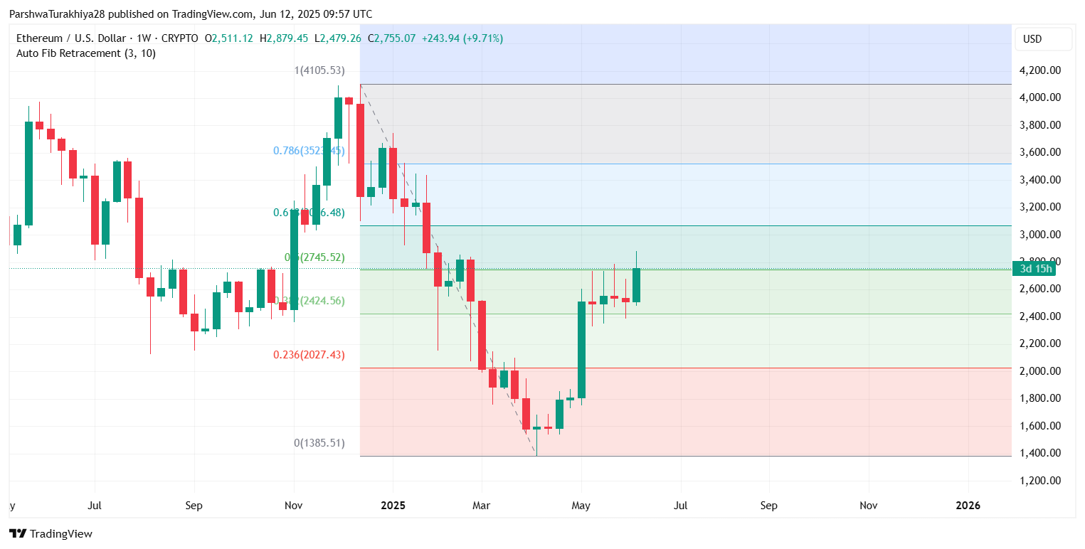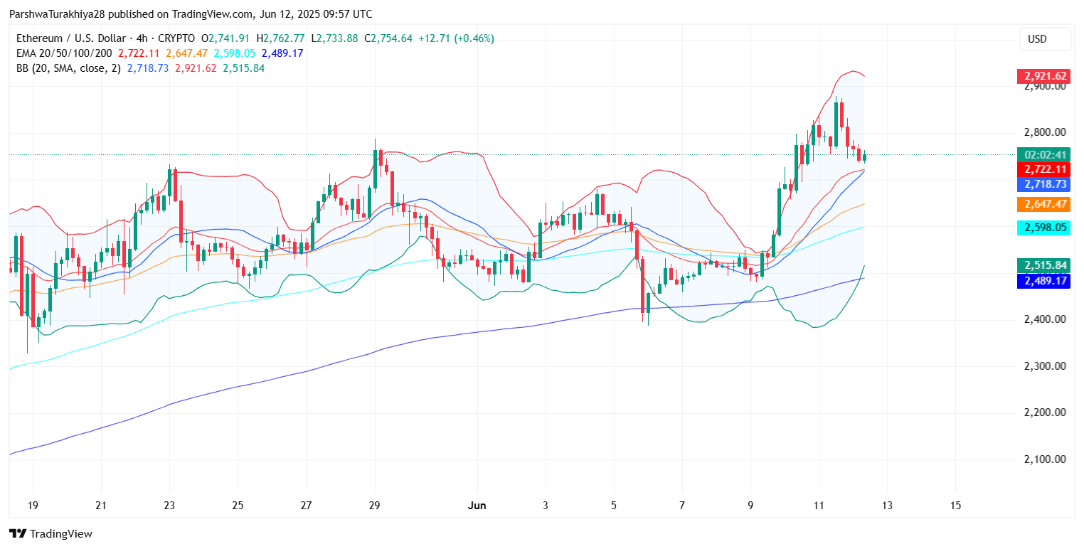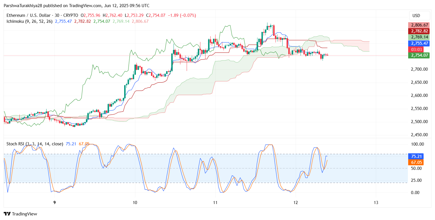 Цена Ethereum сегодня держится около $2755 после волатильной сессии 12 июня, когда быки ненадолго отвоевали уровень $2800, прежде чем немного перейти в консолидацию. Хотя краткосрочный импульс остыл, более широкая структура тренда остается бычьей, поскольку цена удерживается выше ключевых скользящих средних и восстанавливает важные уровни прорыва с начала этого месяца.