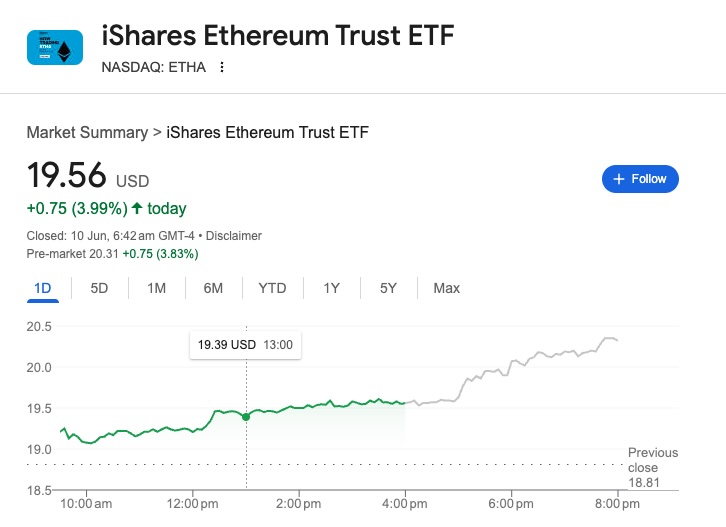После некоторого давления со стороны продавцов на прошлой неделе цена акций ETHA резко отскочила от уровня $18,0, поднявшись на 4% в понедельник, и вернулась к торгам на уровне $19,56. Сегодня в часы предпродажной торговли в США акции выросли еще на 4,14%, достигнув, таким образом, $20,38. За последний месяц акции ETHA столкнулись с многочисленными отклонениями на уровне $20,5. Преодоление этого сопротивления может привести к крупному прорыву вверх.