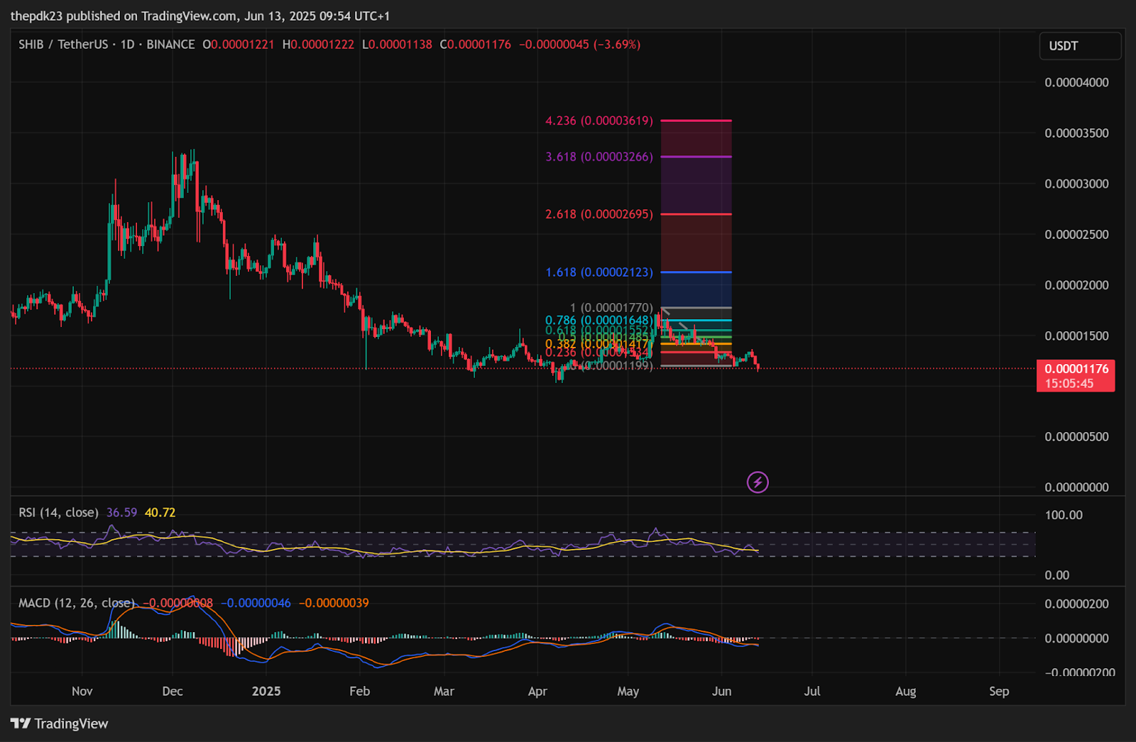 Цели роста находятся на расширениях Фибоначчи, а сопротивление наблюдается около $0,00001648 (0,786 Фибоначчи) и $0,00002123 (1,618 Фибоначчи). Более широкая зона прорыва лежит между $0,00002695 и $0,00003619, что будет означать массивный бычий разворот.