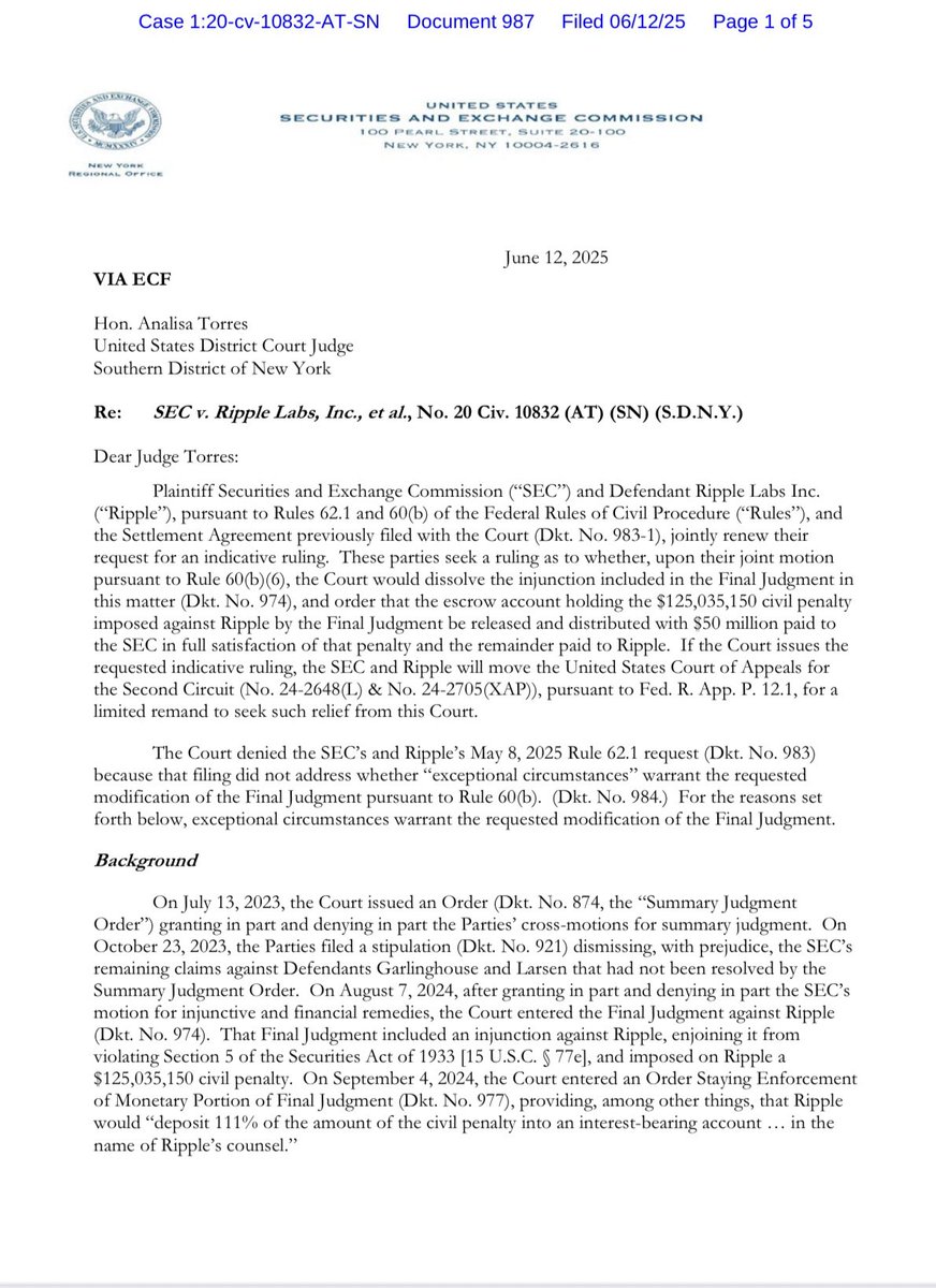 Такие тормоза SEC бесят не только на ETF-фронте. Одним из самых длинных и горячо обсуждаемых кейсов остаётся дело Ripple. Недавно всплыло, что SEC и Ripple вместе обратились в суд Манхэттена с просьбой снять судебный запрет и распределить штраф в 125 миллионов долларов, который сейчас заморожен.