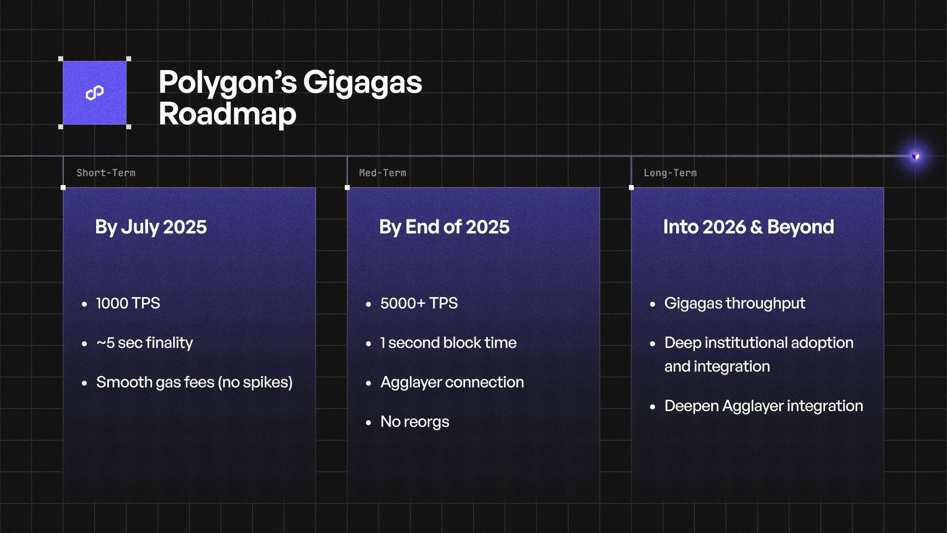 Команда проекта Polygon представила дорожную карту Gigagas, нацеленную на достижение пропускной способности в 100 000 TPS. Первое крупное обновление в мейннете в рамках этого плана — Bhilai — ожидается в июле 2025 года.