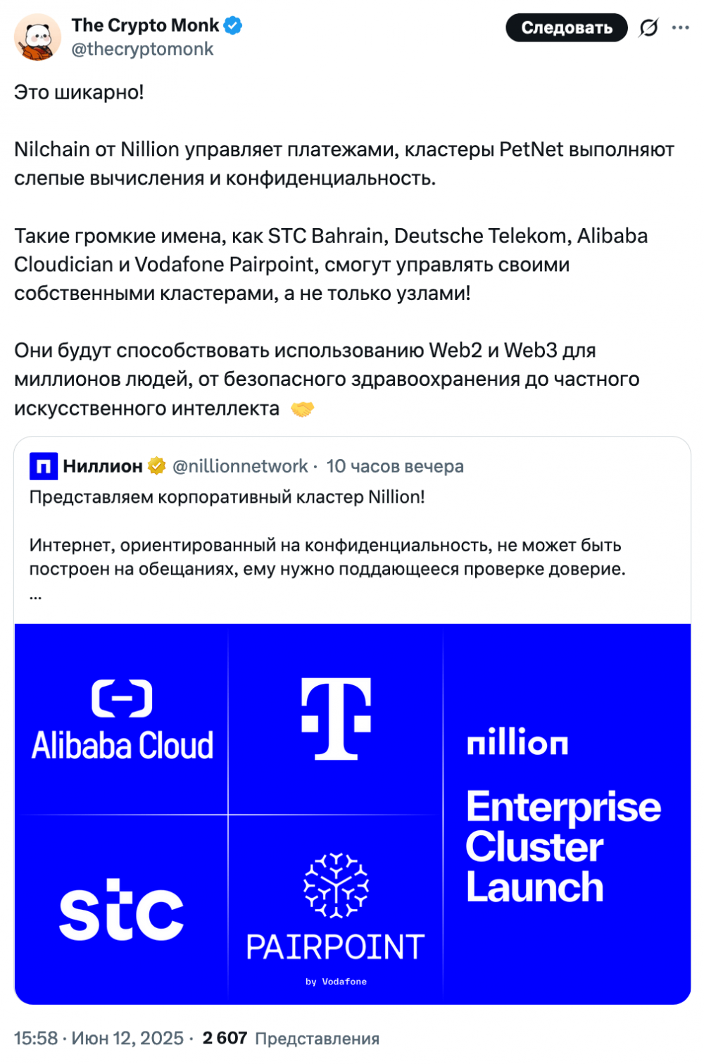 «Впервые организации могут выполнять вычисления с зашифрованными данными в децентрализованных кластерах, не теряя при этом конфиденциальность, — заявил сооснователь и главный научный сотрудник Nillion Мигель де Вега. — «Это показывает, что технологии с акцентом на приватность уже готовы стать частью корпоративной инфраструктуры».