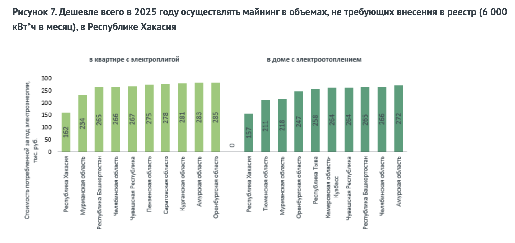 В 2024 году большинство российских регионов ввели дифференцированные тарифы на электроэнергию для населения и майнинг-ферм. Благодаря изменениям, Хакасия оказалась в числе регионов с наиболее выгодными условиями для добычи цифровых активов физическими лицами при потреблении до 6 000 кВт·ч в месяц. В таком случае им не нужно регистрироваться в специальном реестре.
