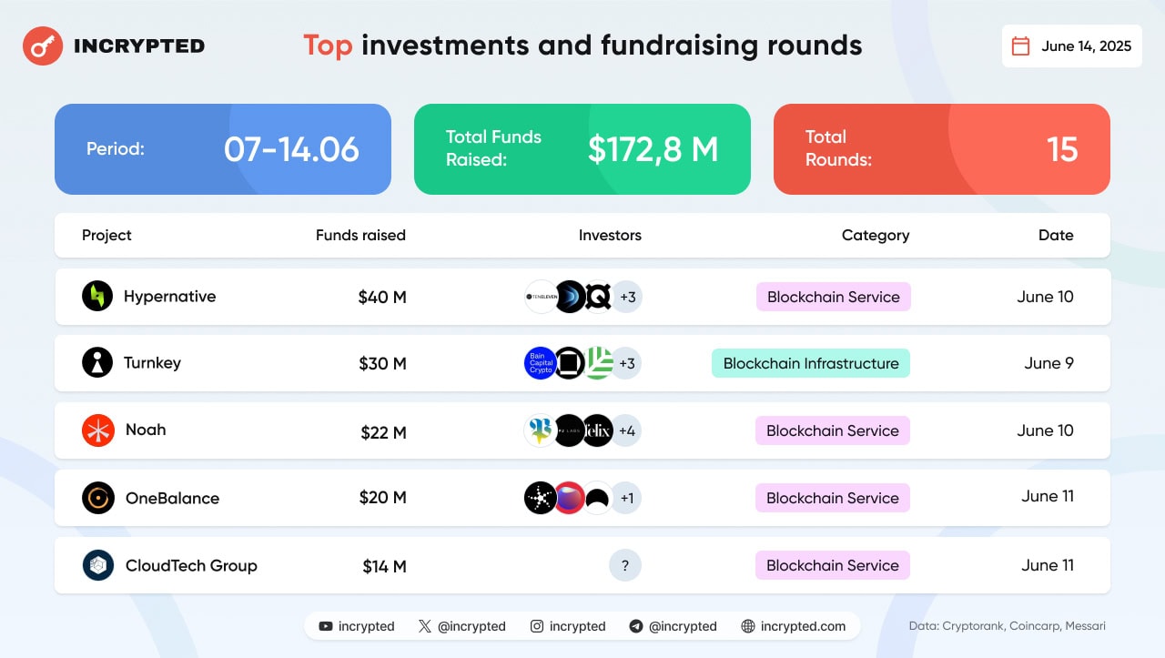 В период с 7 по 14 июня 2025 года 15 проектов привлекли инвестиции на общую сумму $172,8 млн. Еще четыре компании не раскрыли объем полученных средств.