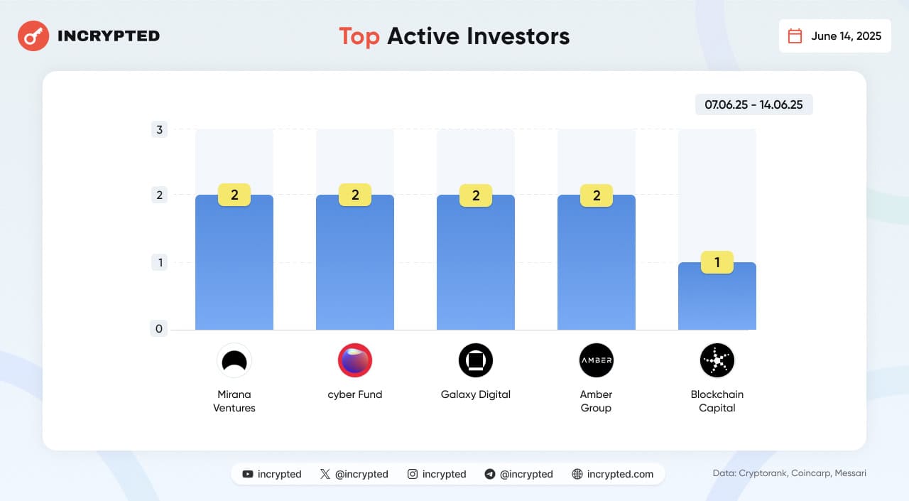 Топ-5 фондов по количеству инвестиций в период с 7 по 14 июня, согласно данным CryptoRank: