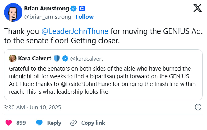 Эти слова он опубликовал вскоре после поста Карры Калверт, главы отдела по связям с правительством в Coinbase. Та поблагодарила сенатора Джона Туна за продвижение законопроекта к финальному голосованию, назвав это образцом лидерства в вопросах регулирования.