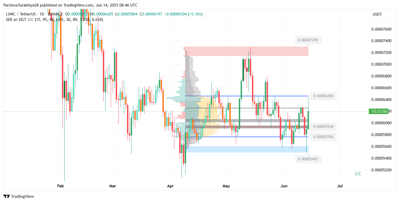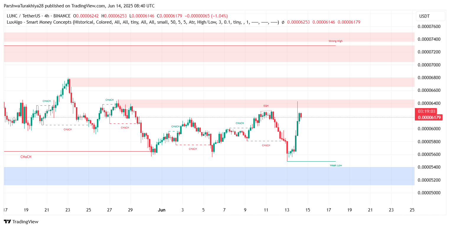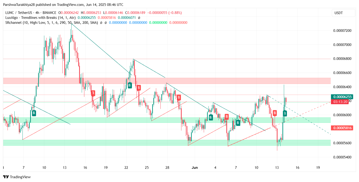 Ценовое действие LUNC 13 и 14 июня показало резкое V-образное восстановление от зоны поддержки $0,000055, что совпадает с историческим блоком спроса, видимым на 4-часовом графике. Эта зона служила трамплином для предыдущих разворотов, и текущая ценовая траектория отражает эту модель. Бычья поглощающая свеча, поддержанная возросшим объемом, помогла LUNC вернуть себе уровень $0,000060, ключевой опорный уровень среднего диапазона для июня.