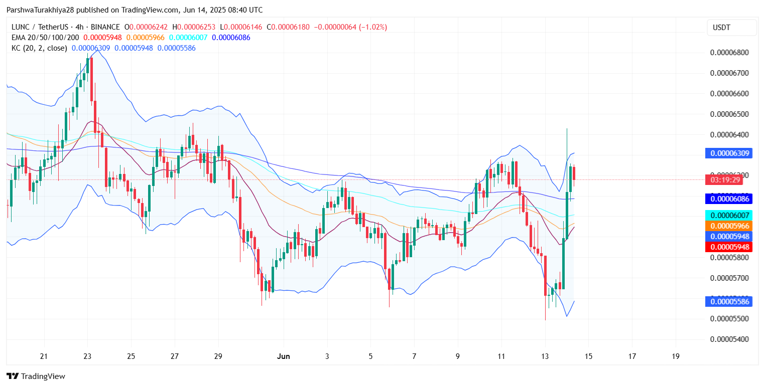 После агрессивного отскока от недавних минимумов цена LUNC сегодня торгуется около $0,0000618, что означает сильное краткосрочное восстановление после капитуляции в диапазоне $0,000055. Этот отскок подкреплен расширением объема и множественными сдвигами индикаторов на 4-часовых и дневных графиках, что указывает на возобновление бычьего интереса. Теперь трейдеры внимательно следят за тем, сможет ли текущий прорыв выше краткосрочных зон сопротивления перерасти в устойчивое восходящее движение.