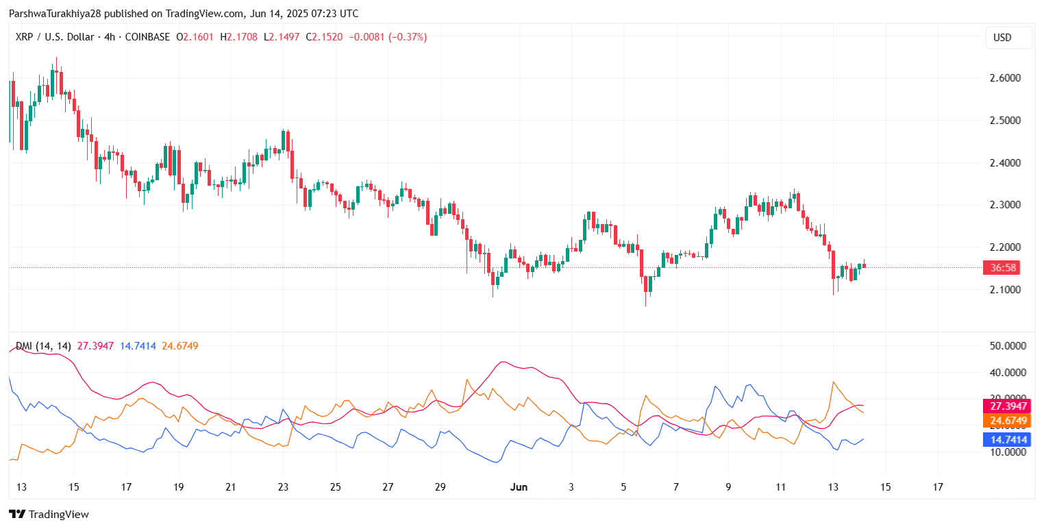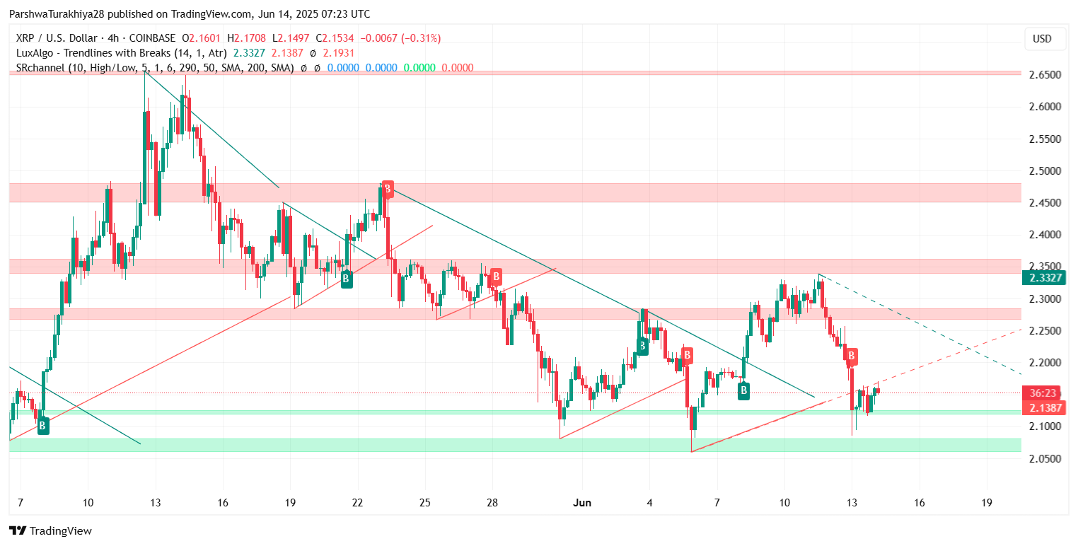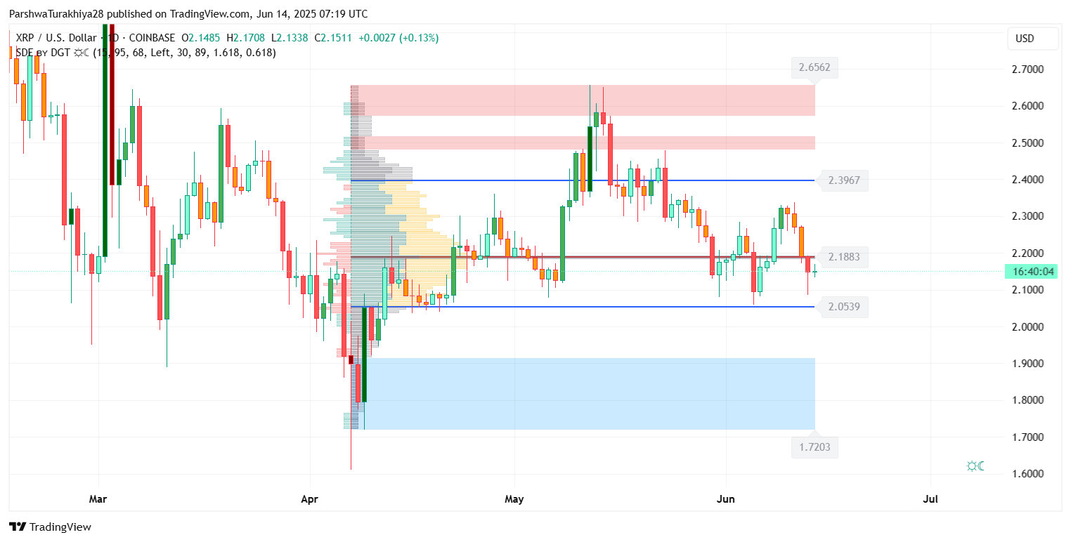 Вопрос о том, почему цена XRP сегодня падает, вытекает из сочетания слияния сопротивлений, угасания восходящего импульса и отсутствия продолжения после отскока на прошлой неделе. Хотя недавнее падение было быстро поглощено около $2,10, XRP продолжает бороться под сопротивлением трендовой линии от пика 7 июня.
