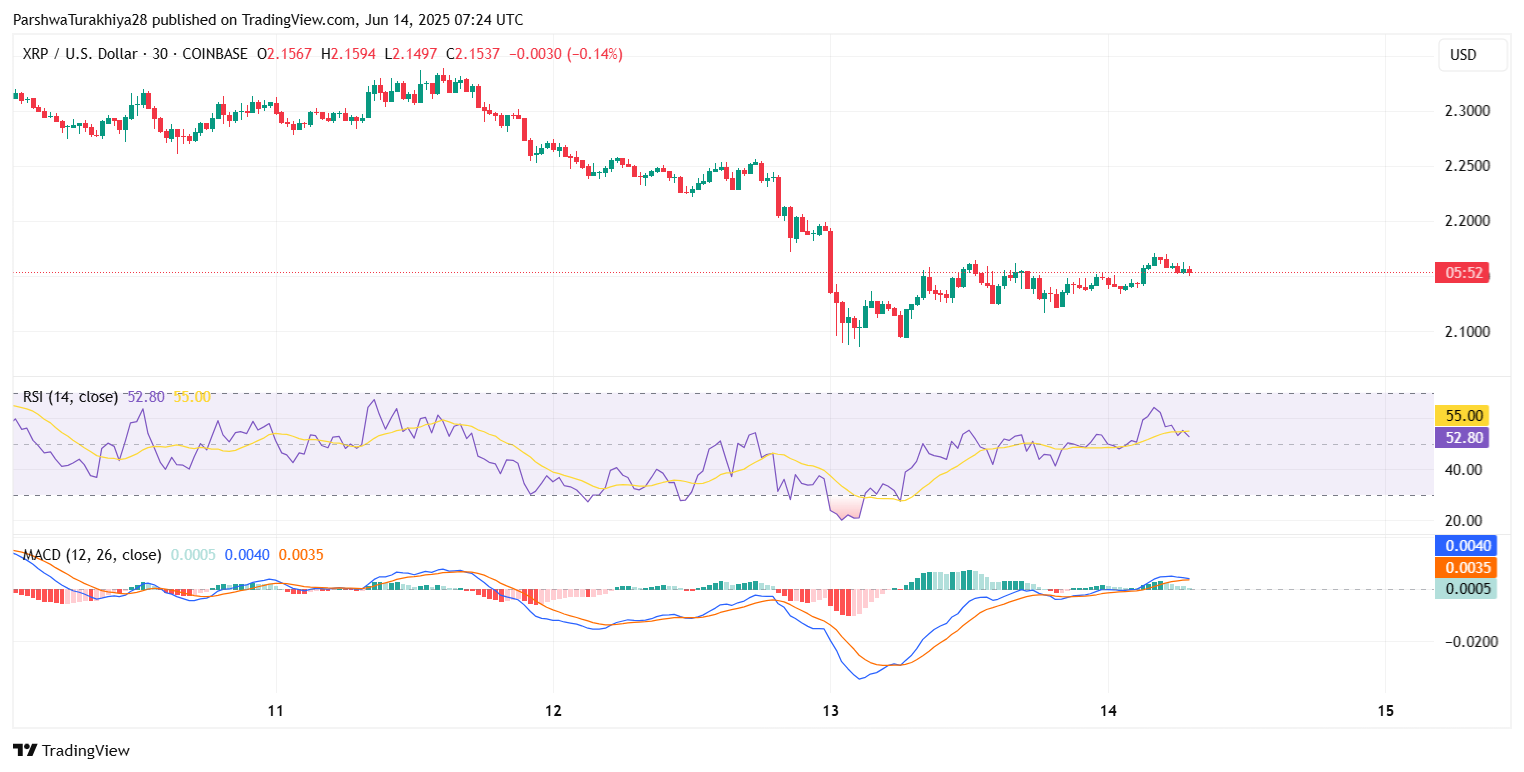 Цена XRP сегодня колеблется около $2,15 после резкого внутридневного восстановления из области $2,10. Несмотря на недавнюю волатильность, быки, похоже, защищают критическую зону спроса, поскольку рынок ждет подтверждения направления. Текущая структура отражает осторожный оптимизм, а индикаторы импульса становятся умеренно положительными после резкой коррекции прошлой недели.