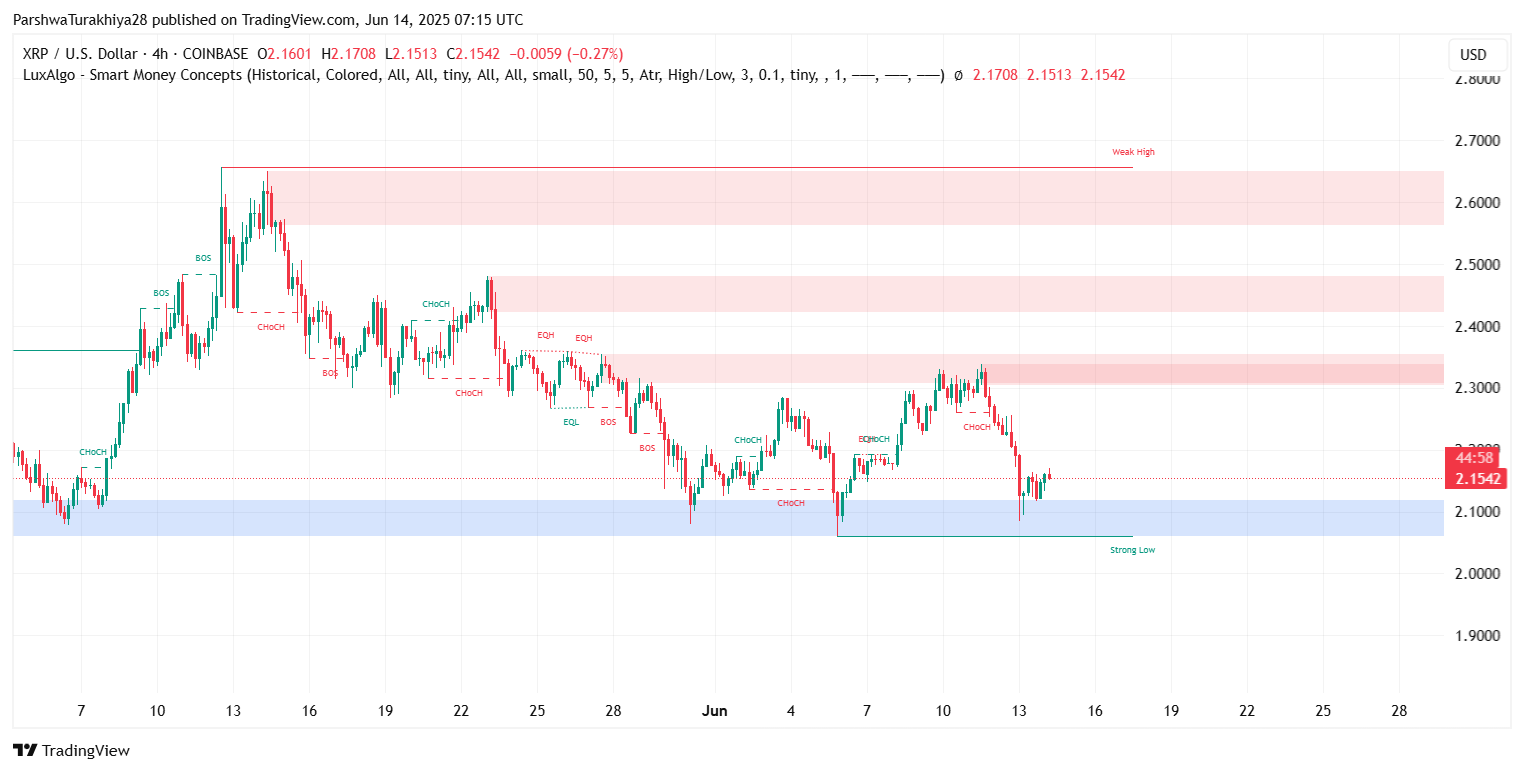 За последние 48 часов ценовое действие XRP стабилизировалось выше сильного блока спроса между $2,06 и $2,10, отмеченного на графике Smart Money Concepts «сильным минимумом» и несколькими сигналами CHoCH. Эта область послужила трамплином для предыдущих ралли и теперь снова демонстрирует устойчивость.