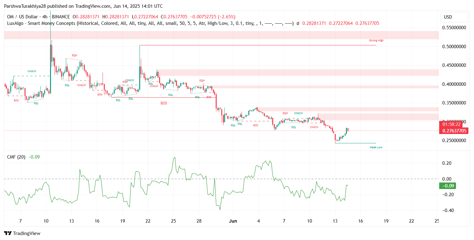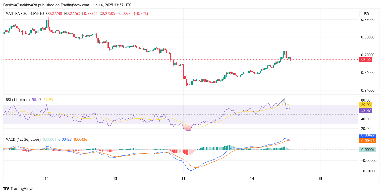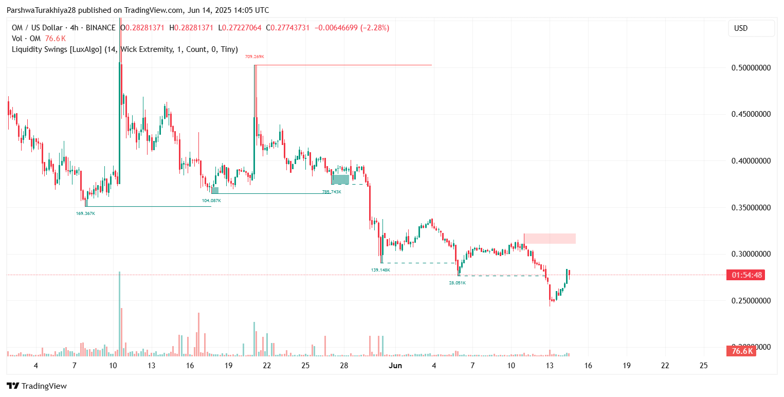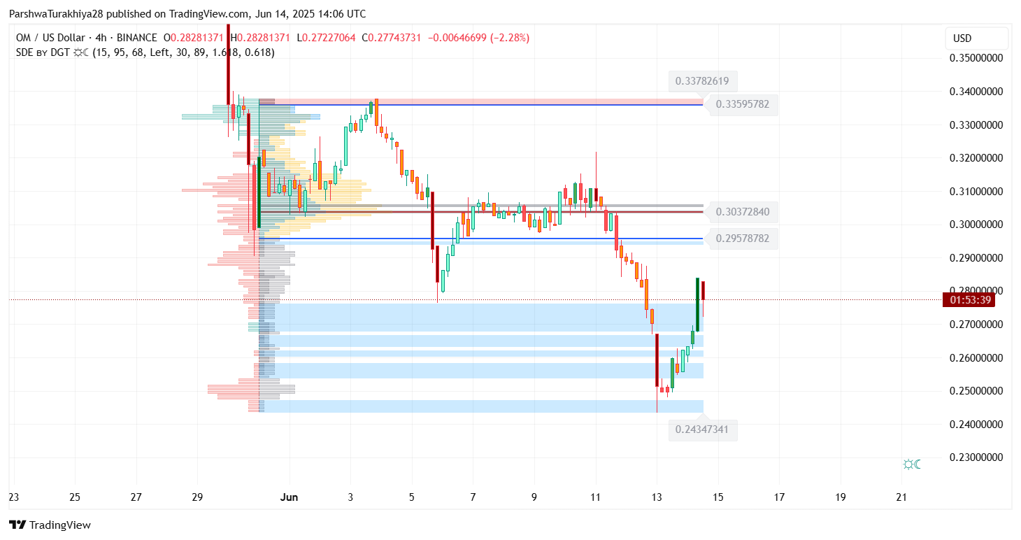 После длительного спада в течение мая и начала июня цена MANTRA (OM) сегодня пытается краткосрочно восстановиться, торгуясь около $0,276 по состоянию на 14 июня 2025 года. Актив отскочил от минимума $0,243, при этом возобновленный интерес к покупке отразился в росте объема и структурном восстановлении на внутридневных графиках. Хотя более широкое давление на понижение остается заметным, технические индикаторы теперь указывают на потенциальный процесс построения базы.