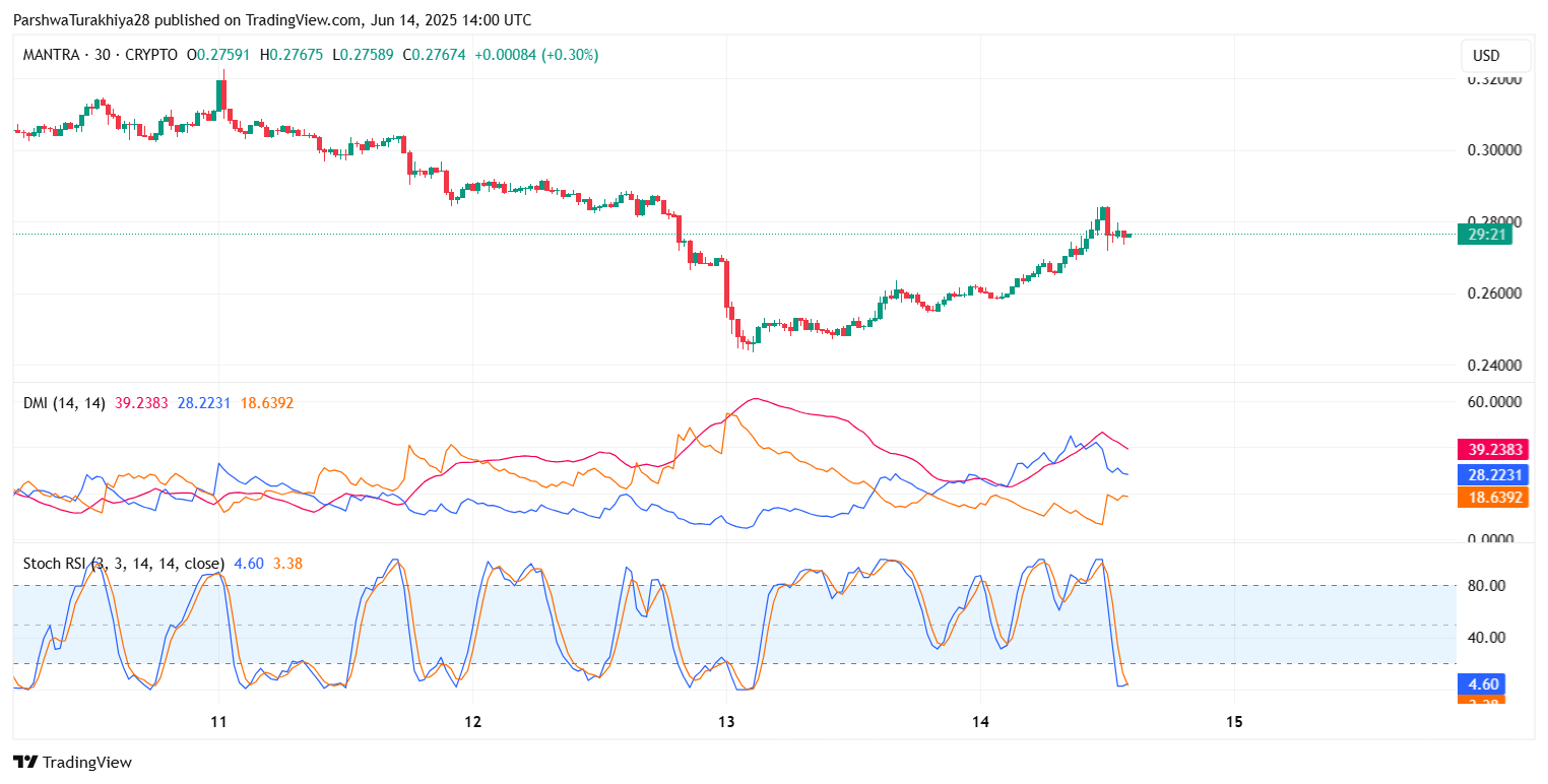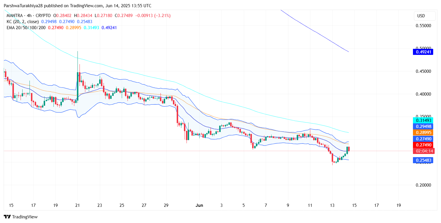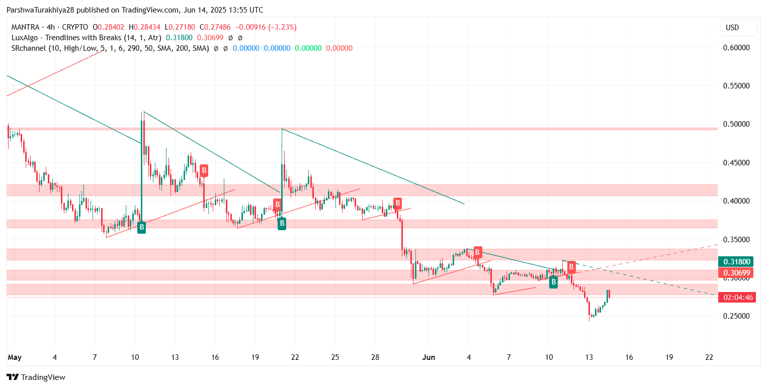 После длительного спада в течение мая и начала июня цена MANTRA (OM) сегодня пытается краткосрочно восстановиться, торгуясь около $0,276 по состоянию на 14 июня 2025 года. Актив отскочил от минимума $0,243, при этом возобновленный интерес к покупке отразился в росте объема и структурном восстановлении на внутридневных графиках. Хотя более широкое давление на понижение остается заметным, технические индикаторы теперь указывают на потенциальный процесс построения базы.