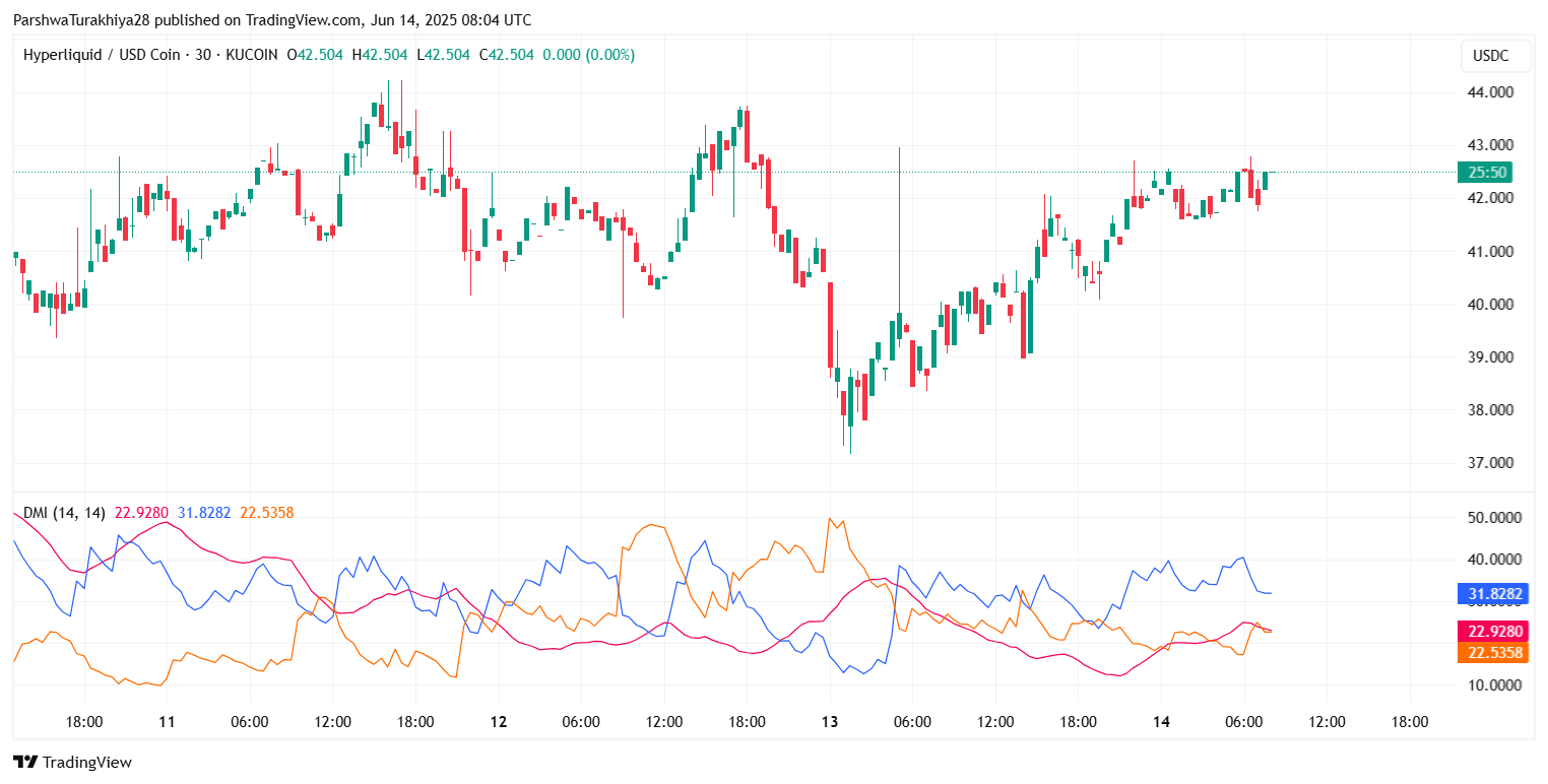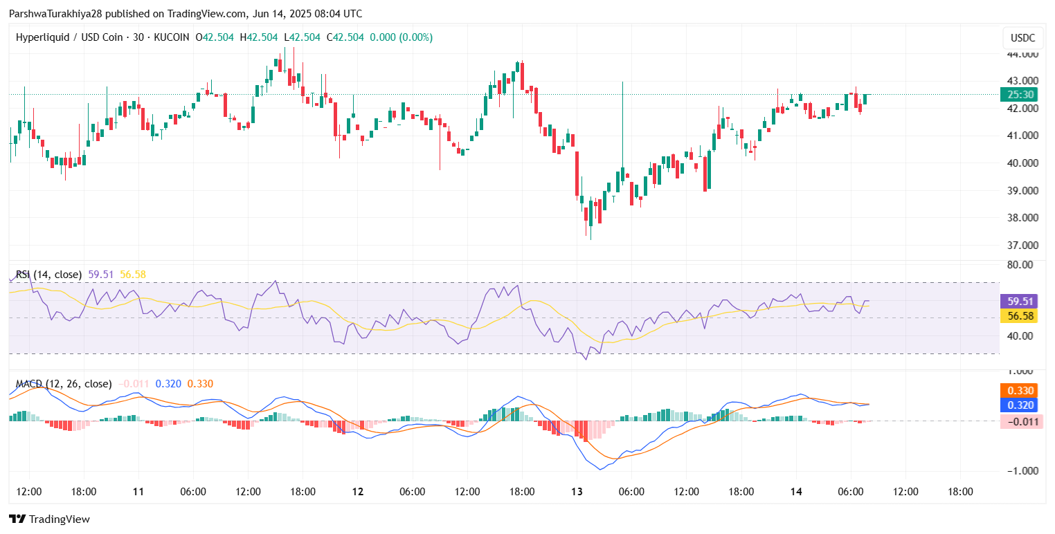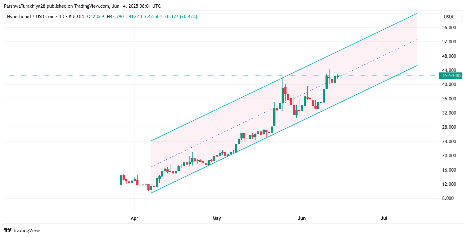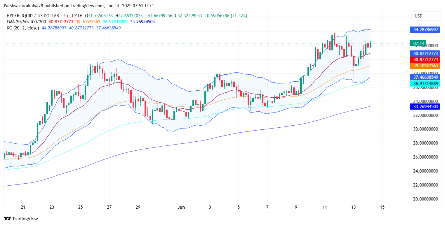 Цена Hyperliquid сегодня колеблется около $42.50 после устойчивого восстановления вверх, которое началось с поддержки $36.50 12 июня. Поскольку ценовое действие теперь повторно тестирует верхнюю полосу краткосрочного диапазона консолидации, а каналы Кельтнера расширяются, быки снова пытаются вернуть восходящий импульс. Более широкая структура по-прежнему демонстрирует устойчивость, а Hyperliquid сохраняет свою позицию в четко определенном восходящем канале с апреля.