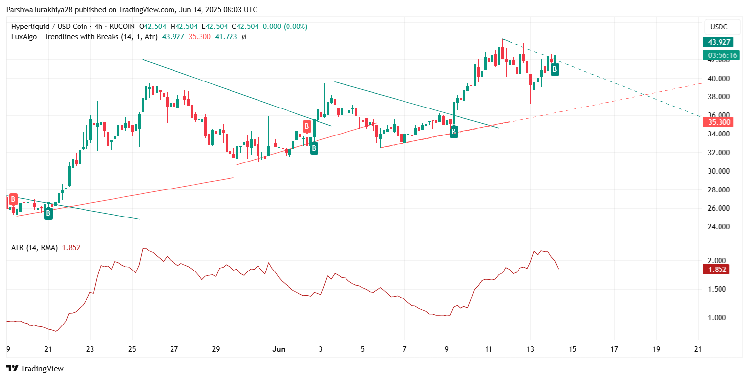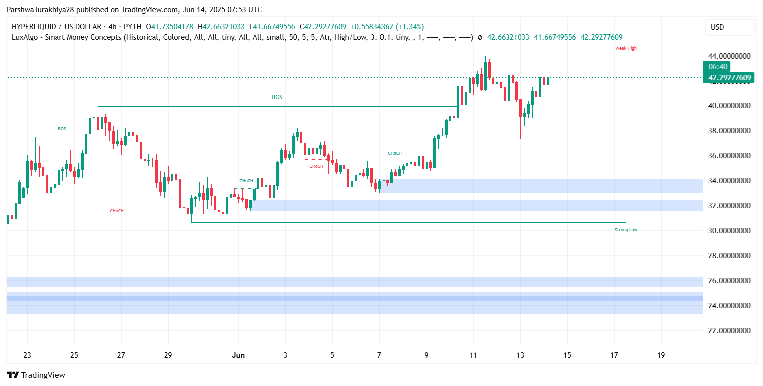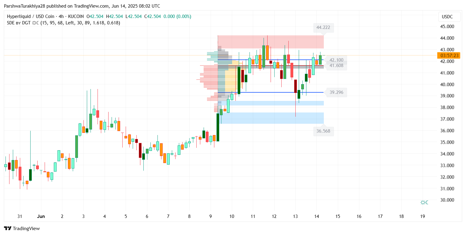 Ценовое действие Hyperliquid остается конструктивным как на 4-часовом, так и на дневном графиках. По состоянию на 14 июня цена резко отскочила от блока спроса $39,20, восстановив силу, чтобы бросить вызов верхнему сопротивлению на уровне $44,20, который отмечает предыдущий максимум и ключевую зону предложения.