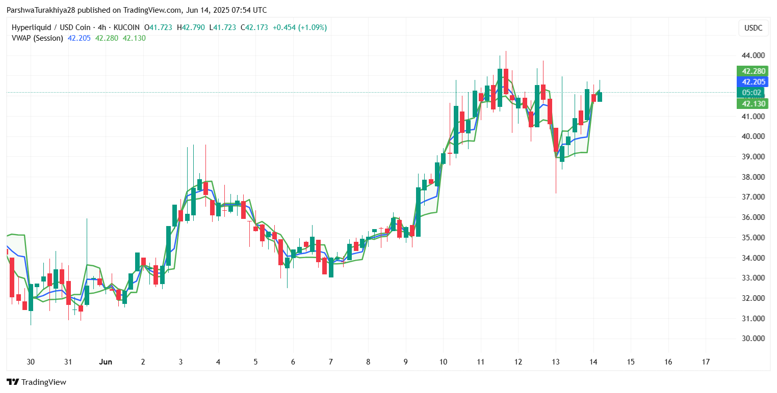 Индикатор VWAP на 4-часовом графике показывает сессионную среднюю около $42.13, а цена сейчас колеблется чуть выше нее. Это указывает на принятие рынком более высокого диапазона и позиционирует Hyperliquid в верхней премиальной зоне.