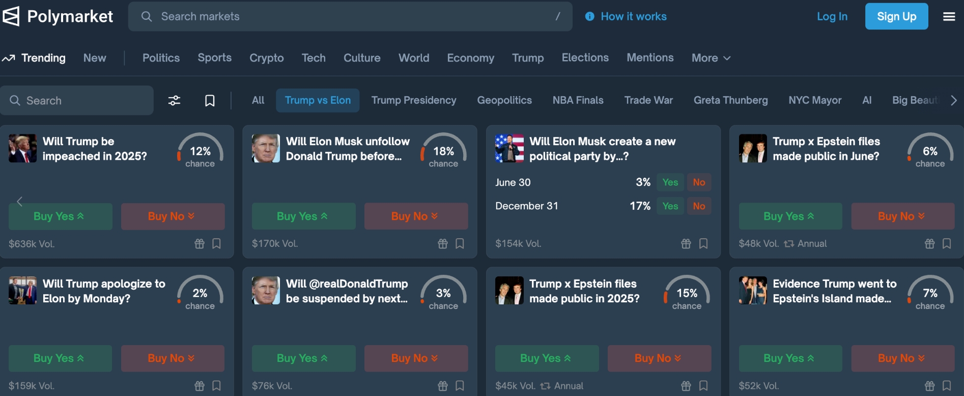 В ходе ссоры Маск поддержал в соцсети X идею о том, что надо объявить Трампу импичмент. В то же время самым популярным в категории Trump vs Elon на Polymarket стал пул «Будет ли объявлен Трампу импичмент в 2025 году». Участники оценивают вероятность этого в 12%.