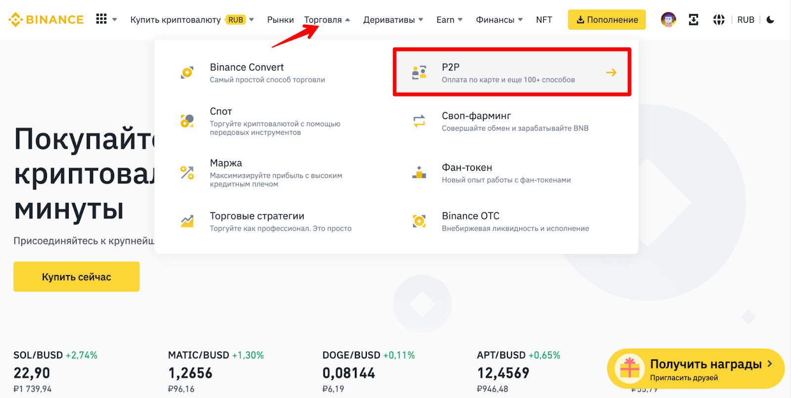 Рассмотрим подробно, как получить деньги через P2P. Для примера возьмем торговую площадку Binance: