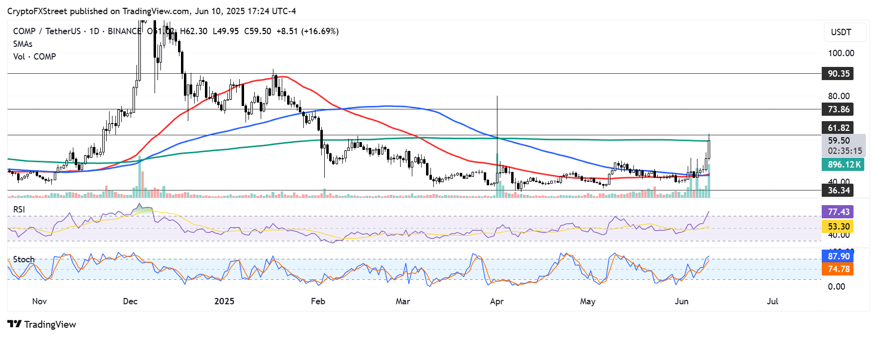 - Compound ha subido más del 30% desde el lunes, enfrentando un nivel de resistencia clave en 61$ y su media móvil simple (SMA) de 200 días. Un movimiento firme por encima de esta resistencia podría ver a COMP extender su movimiento alcista hacia el nivel clave de 73$. A la baja, COMP podría encontrar soporte en la confluencia de las SMAs de 50 y 100 días.