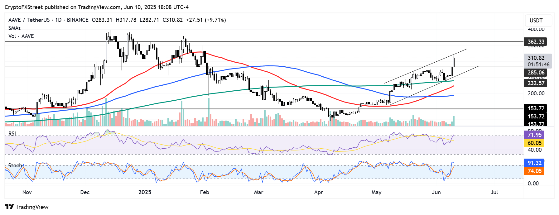- Después de encontrar soporte cerca de la SMA de 200 días, Aave rompió por encima de una resistencia clave en 285$, recuperó el nivel psicológico de 300$ y registró su mayor ganancia en un solo día desde el 1 de febrero el lunes. El token de préstamo/borrowing podría extender su rally a 362$ si rompe por encima del límite superior de un canal ascendente. A la baja, Aave podría encontrar soporte en el límite inferior del canal.