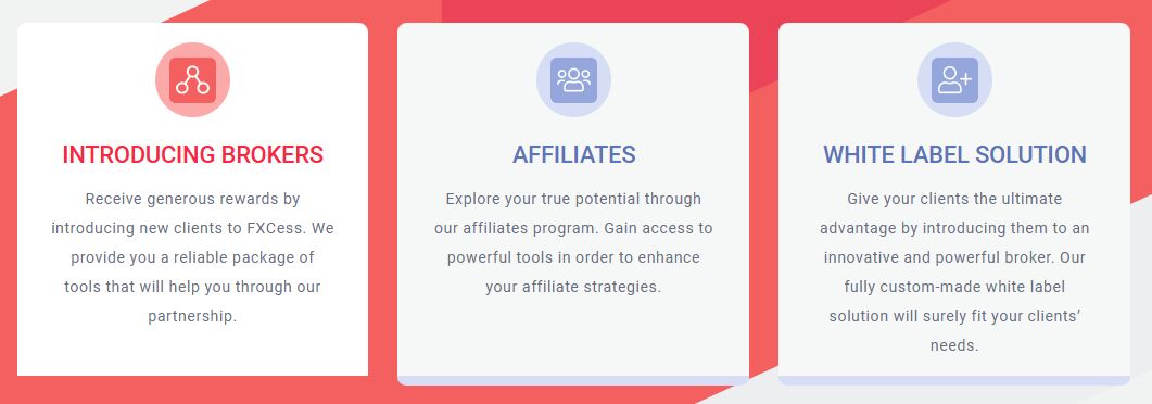 Dieses Angebot richtet sich an Unternehmen, die selbst als Broker tätig werden wollen, denen aber die Infrastruktur dazu fehlt. Es wird eine Vereinbarung getroffen, wonach FXCess im Gegenzug für seine Plattform an den Einnahmen des White-Labels beteiligt wird.