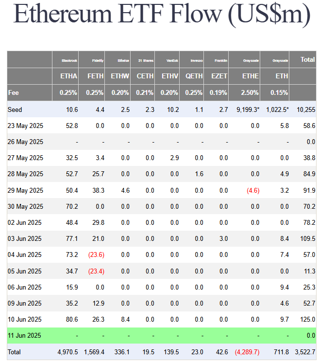 ETHA hat diese Woche bereits 249 Millionen Dollar gesammelt, was 89 Prozent des gesamten Zuflusses in Spot Ethereum ETFs ausmacht. Laut Daten von Farside Investors gibt es vier aufeinanderfolgende Wochen mit Nettozuflüssen und eine ununterbrochene Serie von siebzehn Handelstagen mit Wachstum.