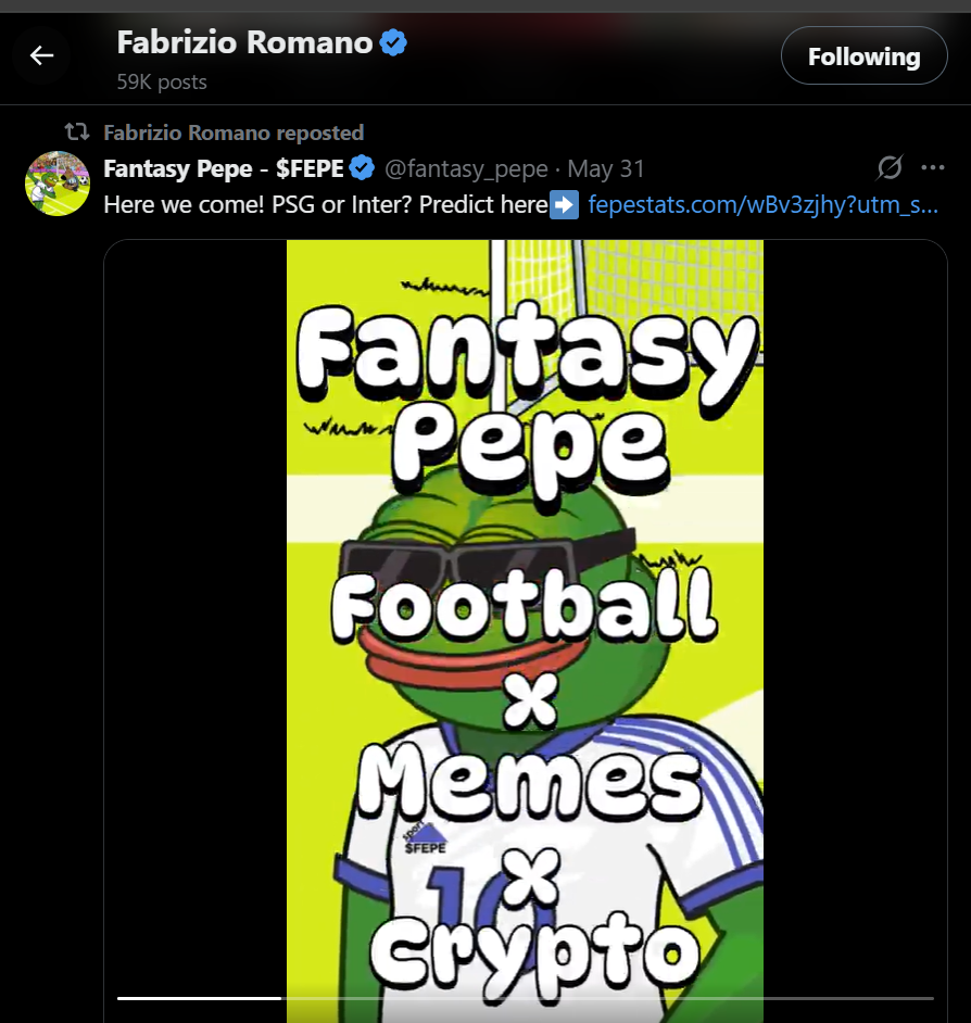 إن التوسع السريع لمجتمع Fantasy Pepe والجاذبية العالمية على القنوات بما في ذلك X (Twitter سابقًا) و Telegram و Instagram يؤكد زخمه من جميع الجوانب. إن مزيجها الطازج من الترفيه الميم وشغف كرة القدم يجذب المستثمرين غير الرسميين ، وموظفي الميم ، والمؤثرين على حد سواء.