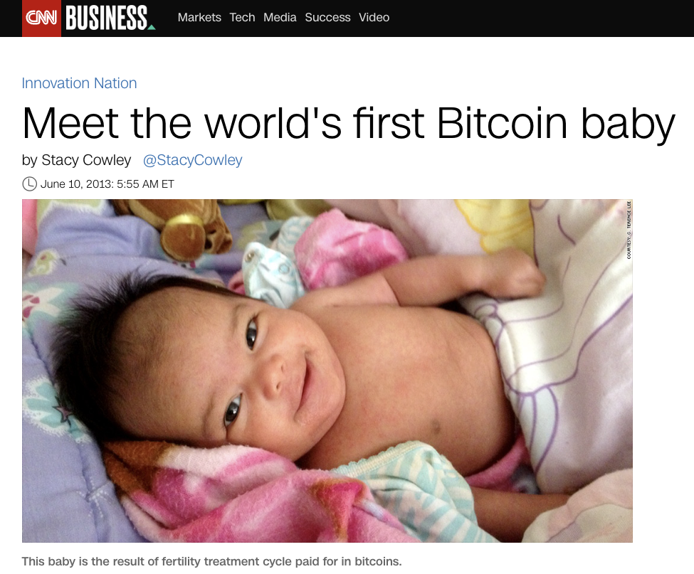 The sperm stuck, leading CNN to reveal, on this day in 2013, “the world’s first Bitcoin baby” — a baby bought entirely with bitcoin. Thirty bitcoin to be exact, an amount then worth $500, or $3 million today.