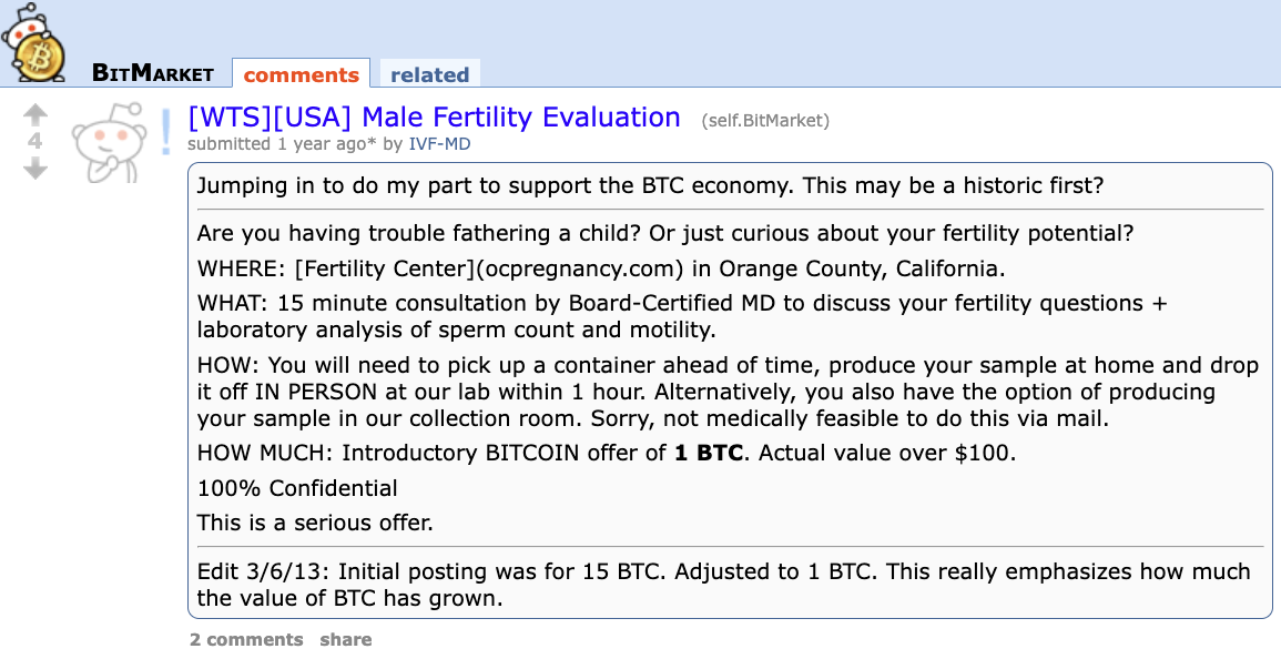 “Jumping in to do my part to support the BTC economy. This may be a historic first?” Lee wrote in a post on the BitMarket subreddit, titled: “[WTS][USA] Male Fertility Evaluation.”