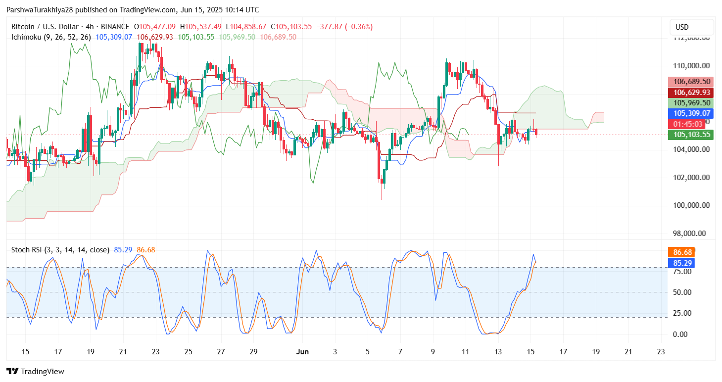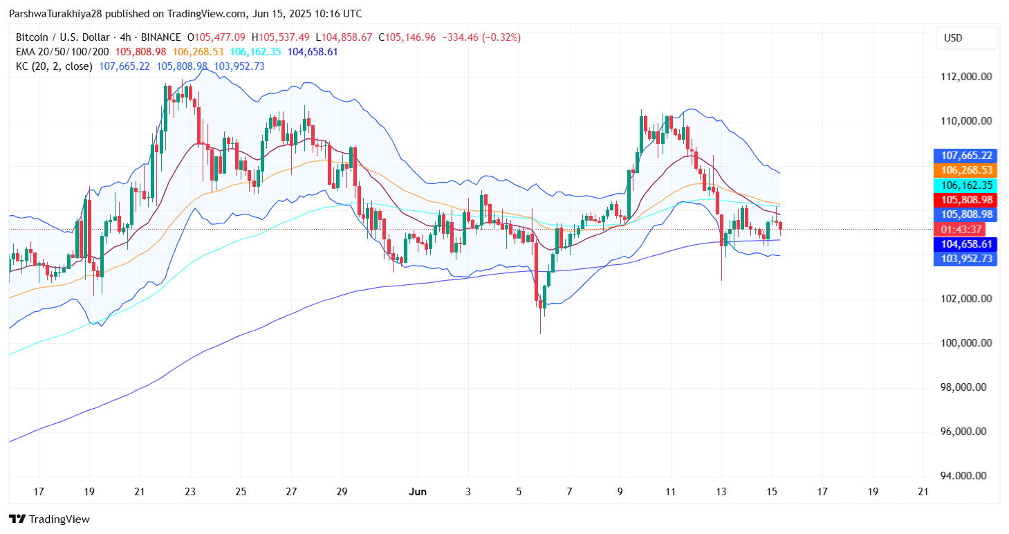 BTC continues to struggle below a critical confluence zone formed by the 20/50/100 EMA band and the Keltner Channel midline on the 4-hour timeframe. The Bitcoin price action faces supply between $105,800 and $106,300, which also aligns with the flat Tenkan-Sen and Kijun-Sen from the Ichimoku Cloud.