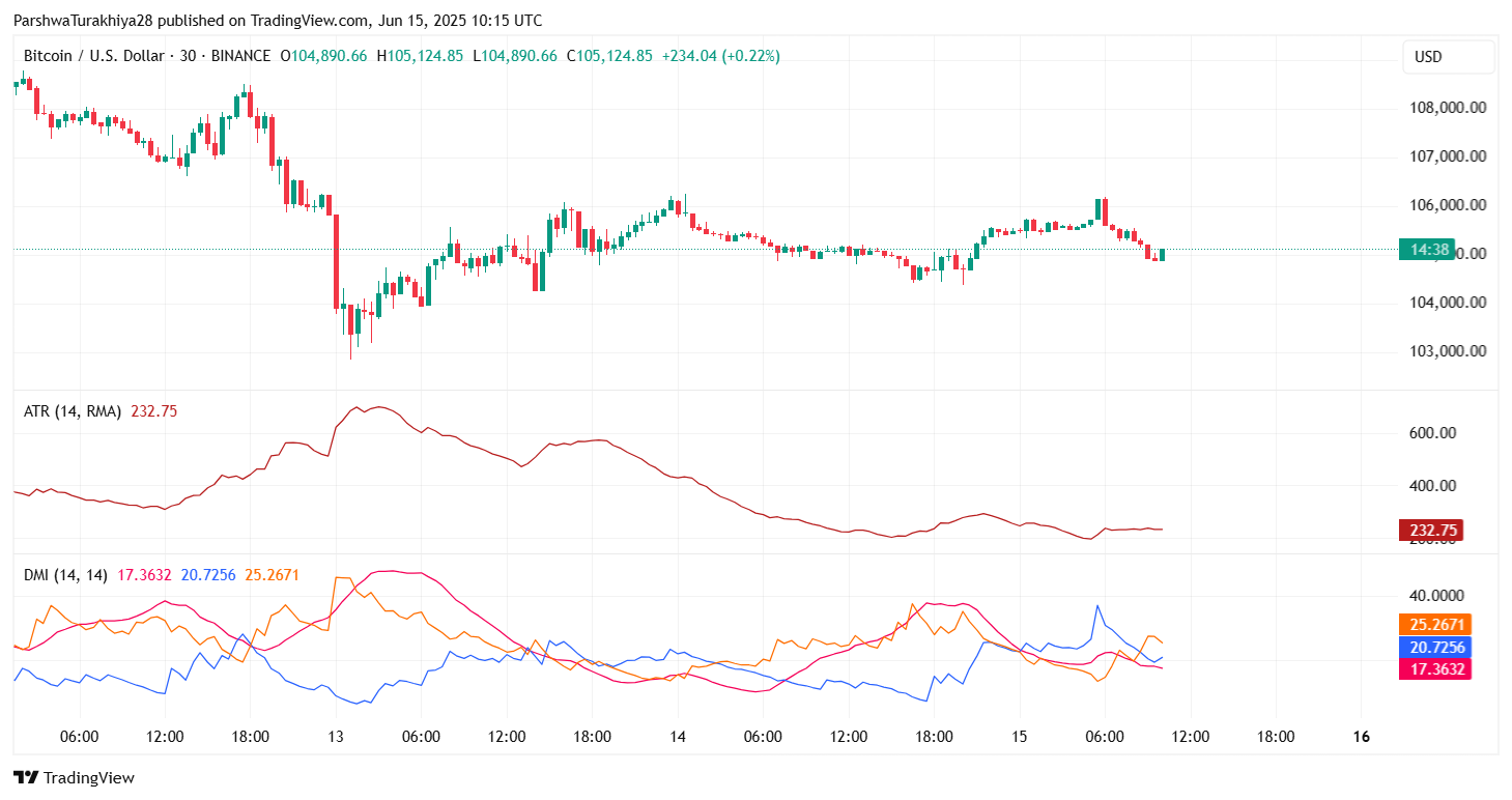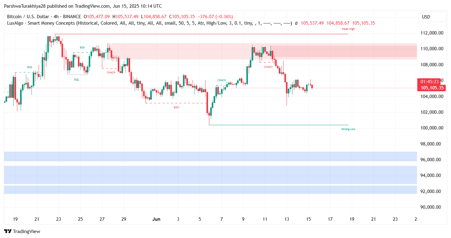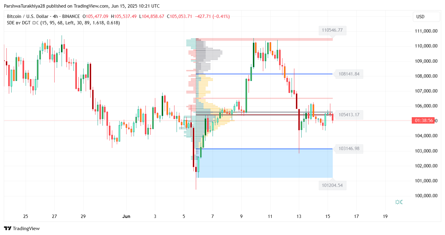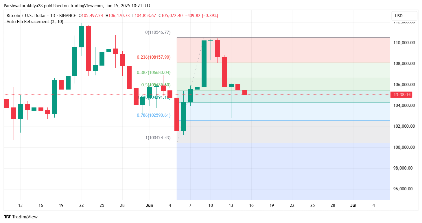 Following the June 13 breakdown below $106,000, the Bitcoin price has been consolidating in a narrowing range, with resistance at $106,000 and support at $104,000. On the daily chart, BTC is sitting at the 0.5 Fibonacci retracement level ($105,485), trying to form a higher low above the 0.618 zone near $104,291. Price action remains neutral, though the latest candles suggest indecision.