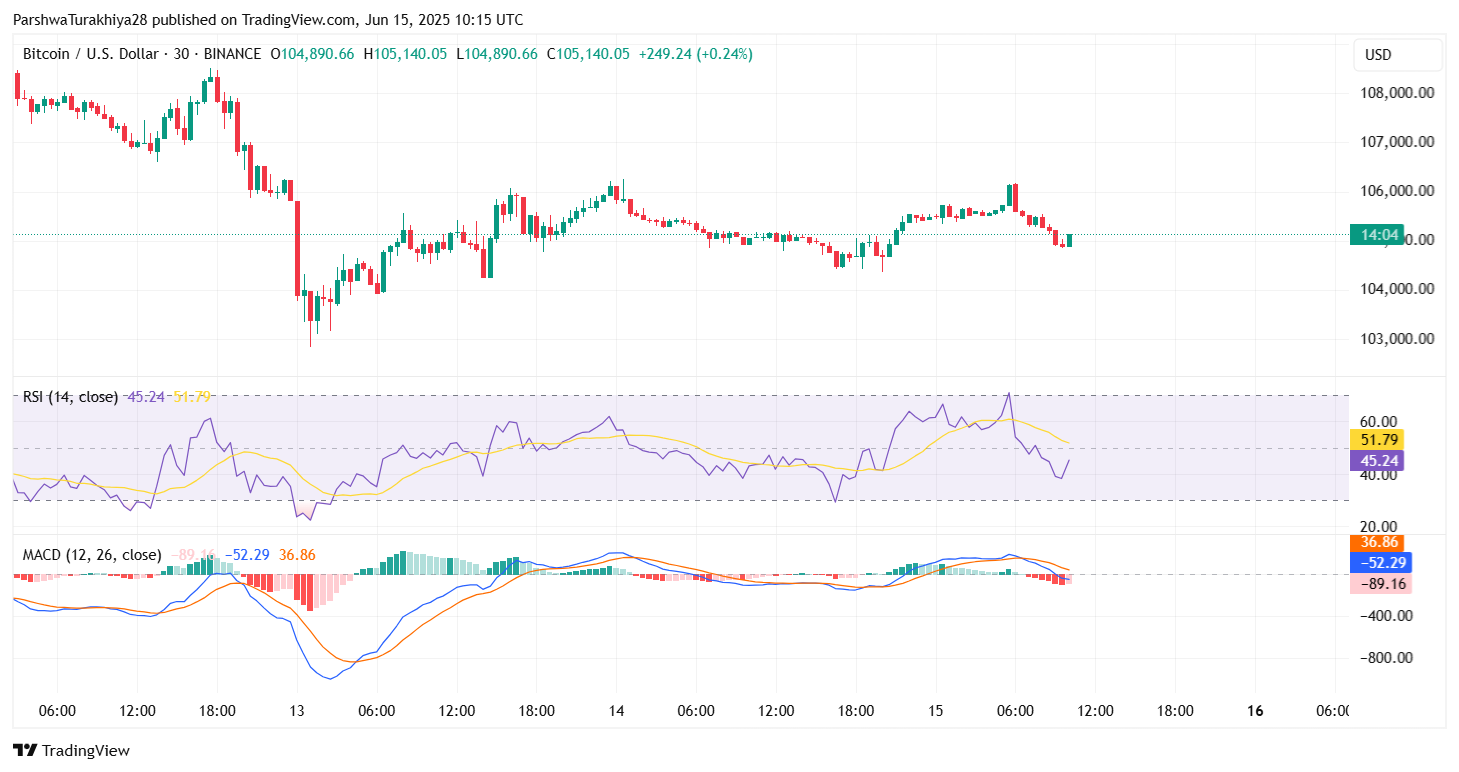 The Bitcoin price is slightly lower today as market participants react to overhead resistance at $105,800 and weak demand at the $106,000 level. The MACD on the 30-minute chart has turned bearish again, while RSI shows a short-term rollover from the 52–53 range back to 45.