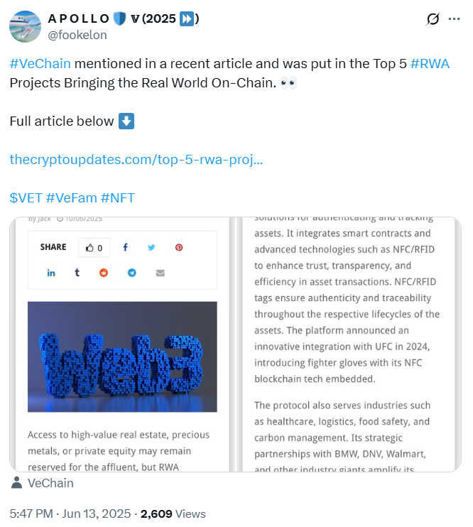 A recent article shared by Fookelon on X releases the details and metrics for the milestone position. The article praises VeChain’s progress in using blockchain tools to make luxury goods, such as fighter gloves. It also mentions other high-value items that can be traced and traded.