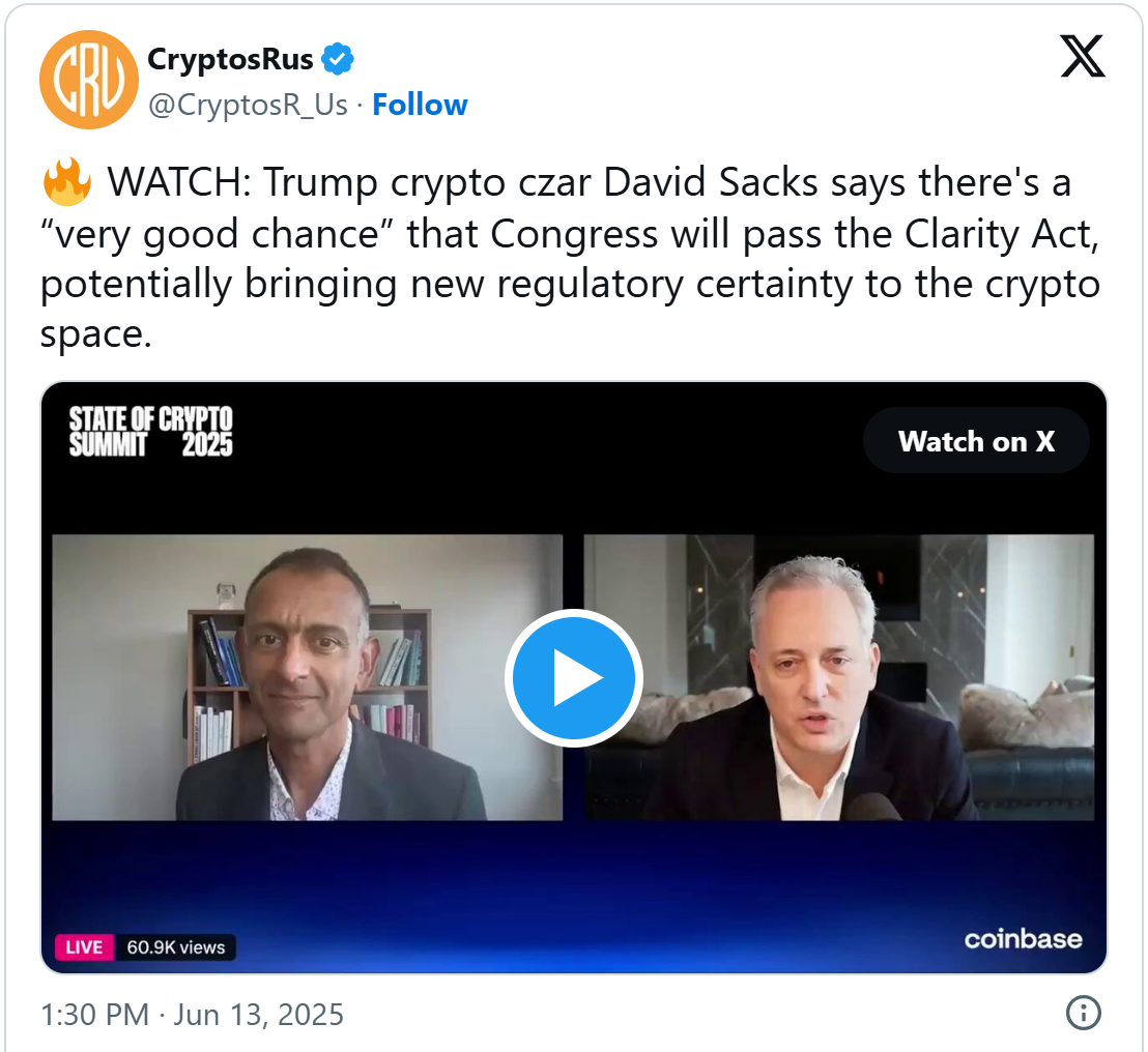 David Sacks noted that the Clarity Act could provide a key regulatory framework for the crypto market for the next 2 decades. He also revealed that he was optimistic about the Clarity Act bill being passed into law.