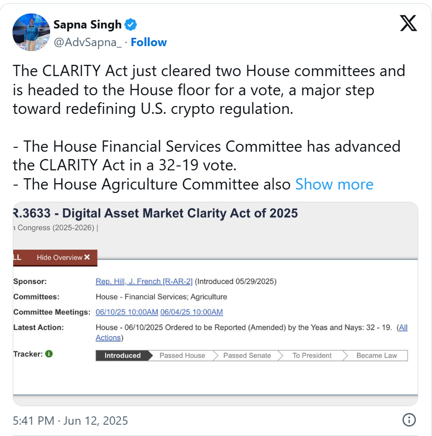Recent updates revealed that the House Financial Services Committee and the House Agriculture Committee recently nodded in favor of the Clarity Act. This means the House floor will soon vote on the bill.